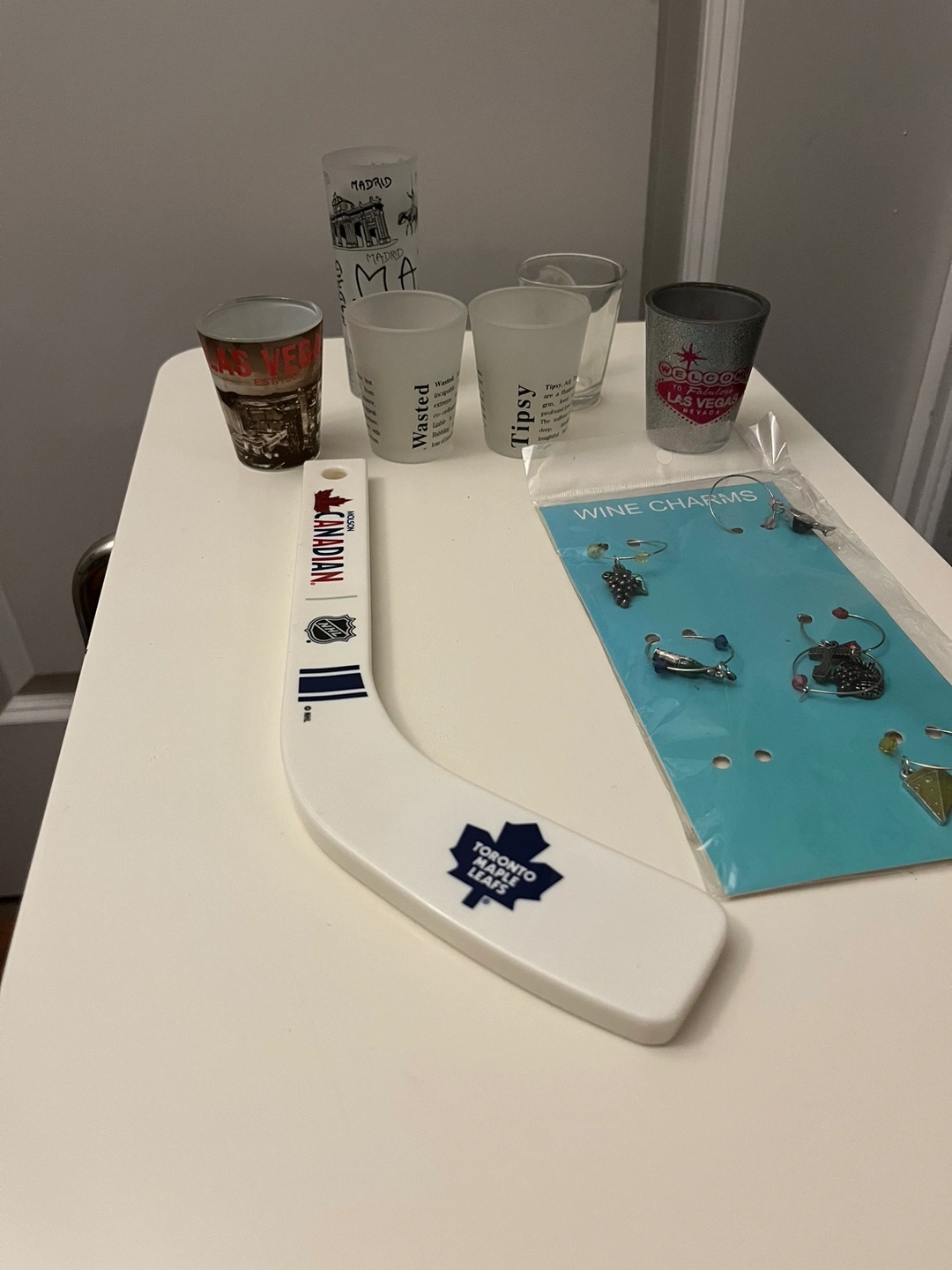 Shot glasses, beer opener and wine glass charm for your party.