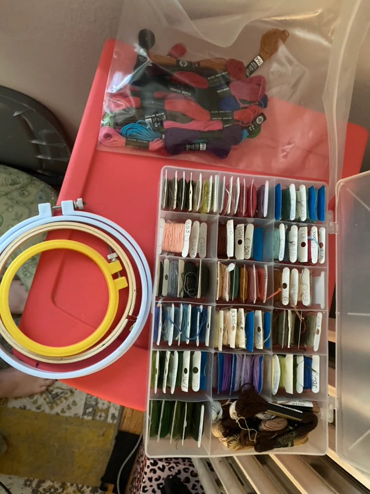Embroidery thread and hoops. Must pick up before Saturday :) if I find more while packing I will add to it.