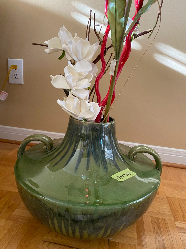 Good quality vase. Size is 17 inches diameter and 12 inches high. Attractive design. Contents not included