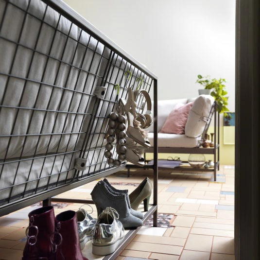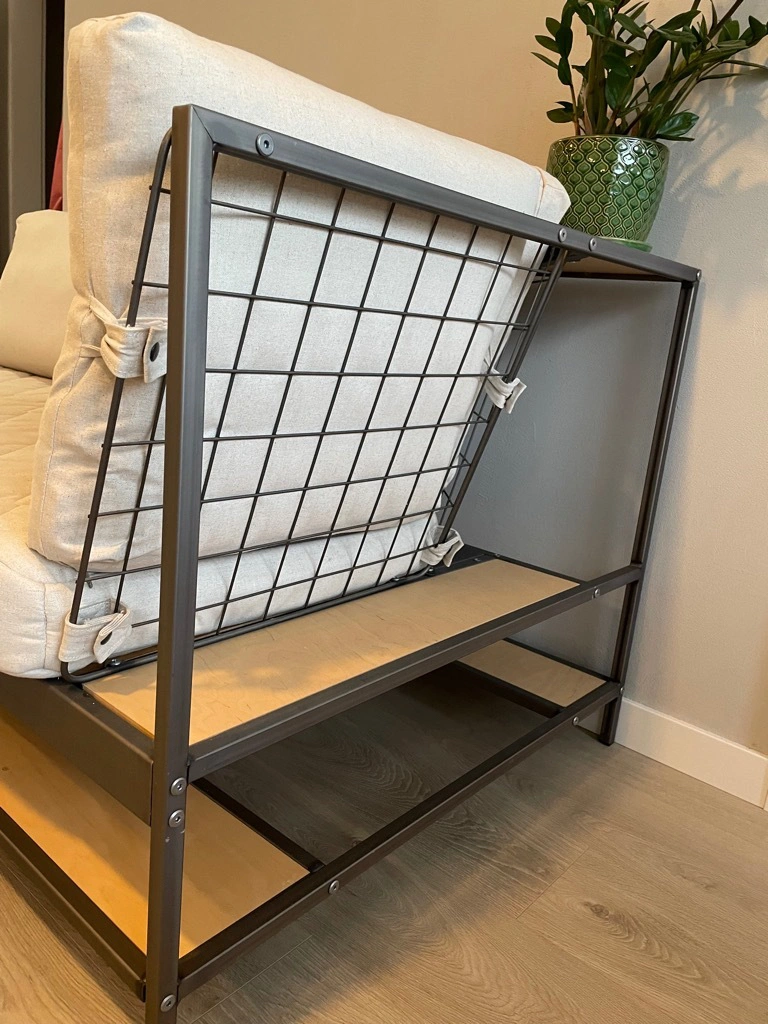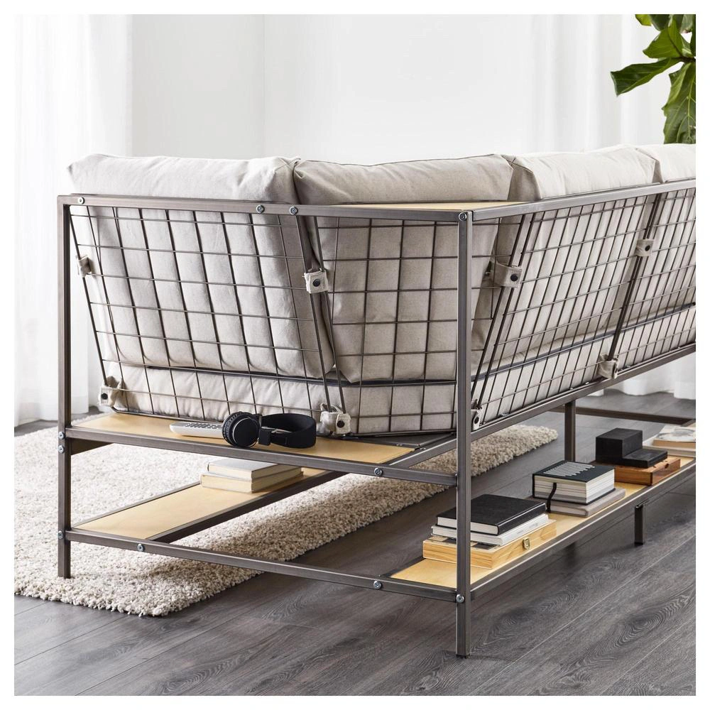It combines wooden shelves underneath and behind the cushions within a metal frame to add storage to a piece that often doesn’t have any.