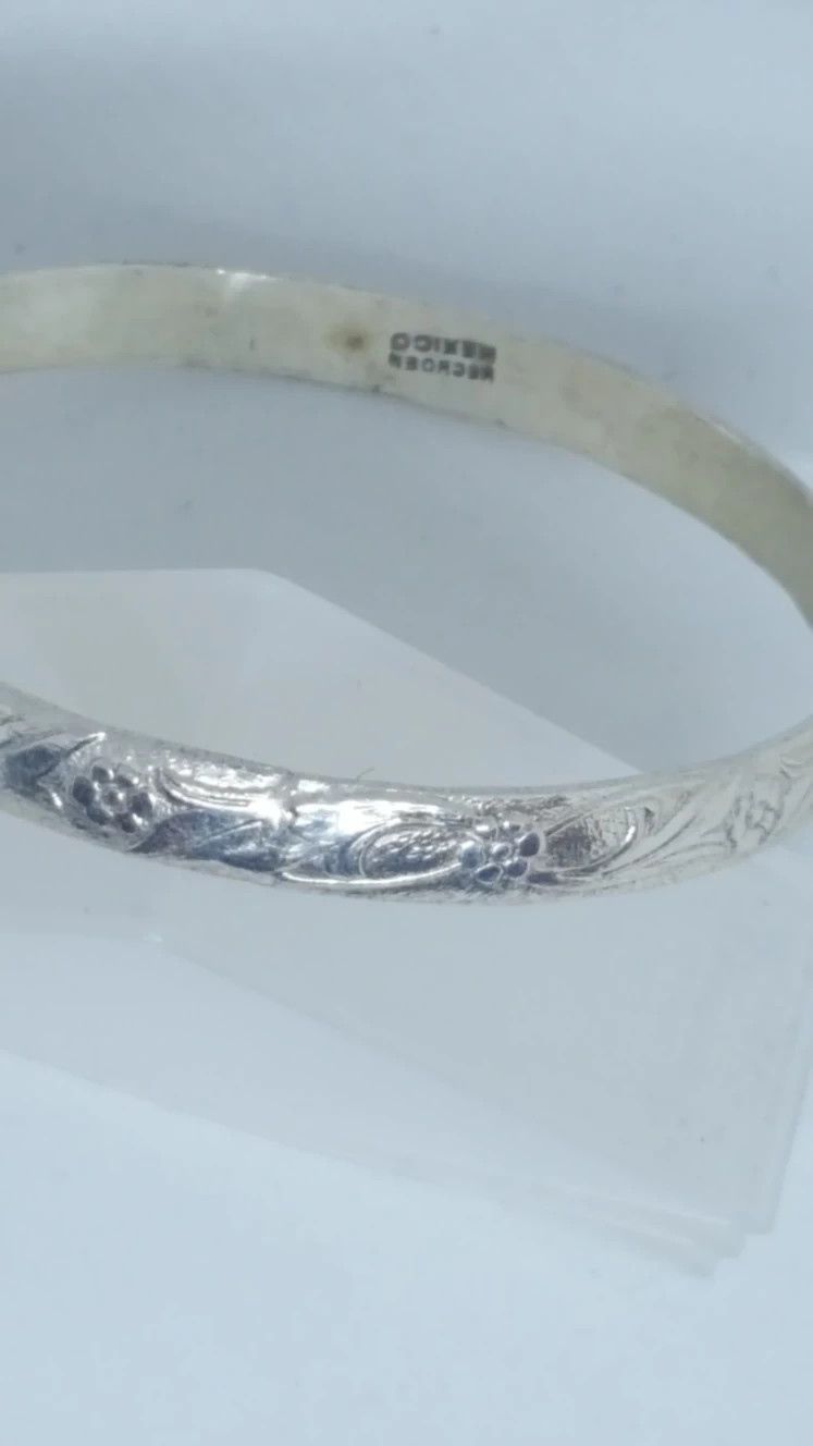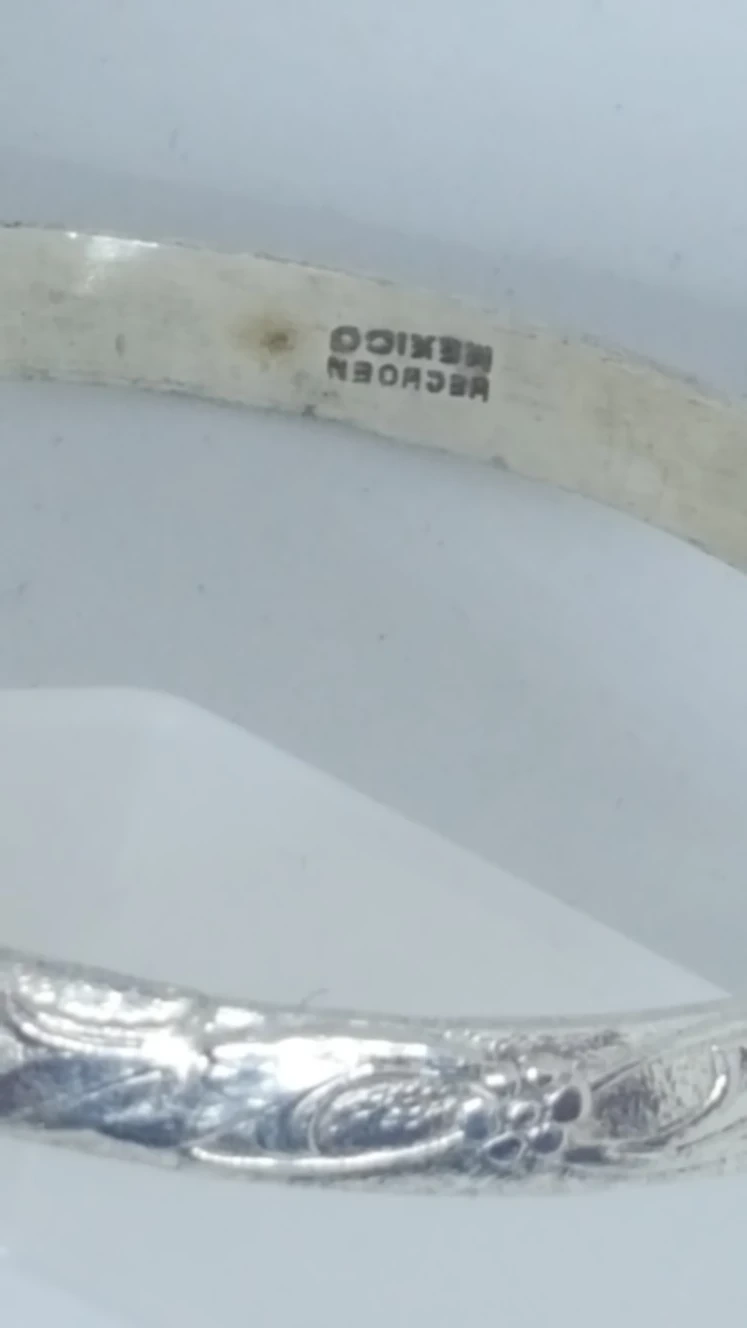 The bracelet has a maker's Mark (shown in picture) but I don't know exactly what it says (Mexico is one word). it is approximately 2.5 inches in diameter. Please note* magnets are attracted to these items, so metal is unknown.