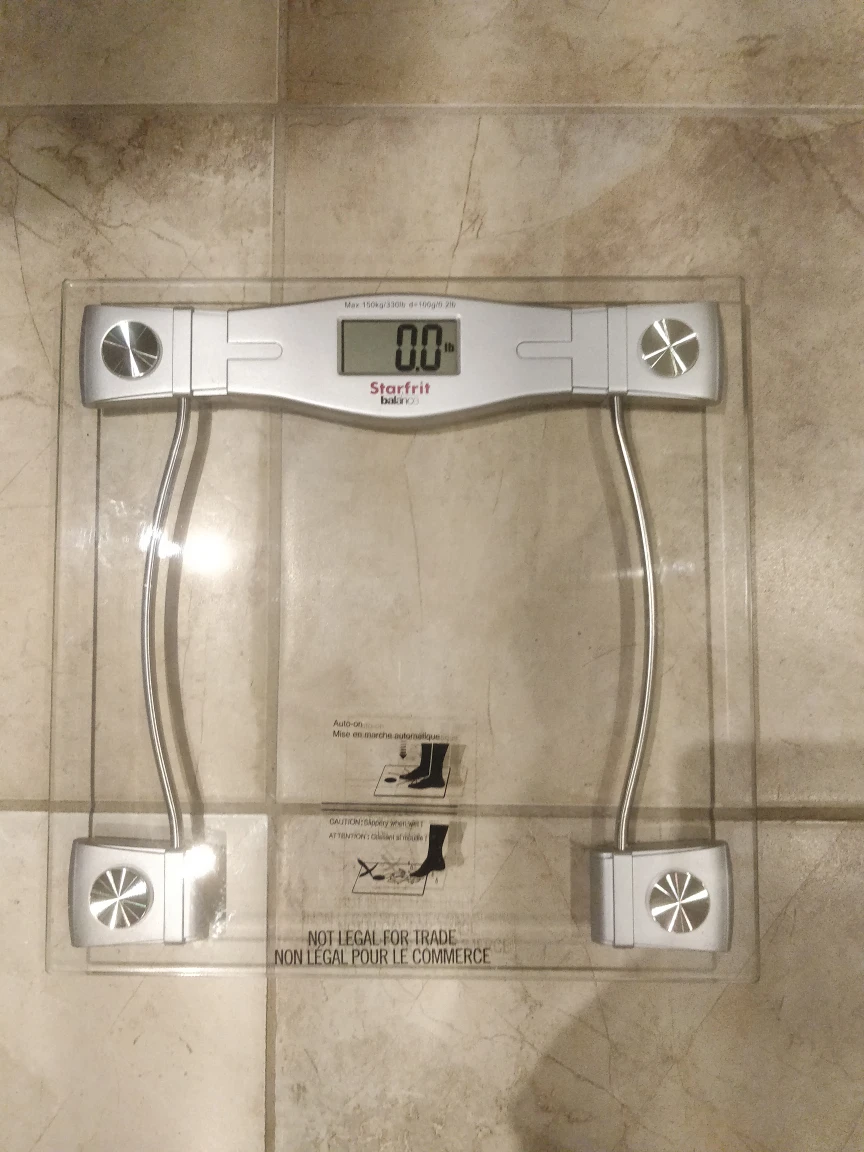 Glass/clear electronic bathroom scale from Starfrit. Gently used. Can switch back and forth between pounds (LBS) and kilograms (KG.). COmes with batteries, which are easy to find and replace. Originally $34.99+ tax, selling it for $10 firm. Pick up only. located near St. Clair West subway station.