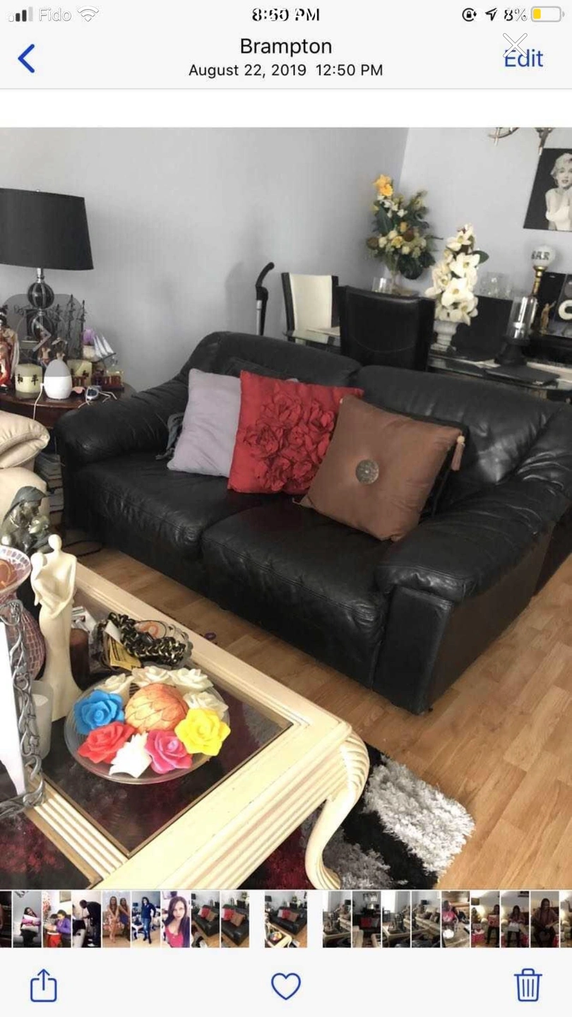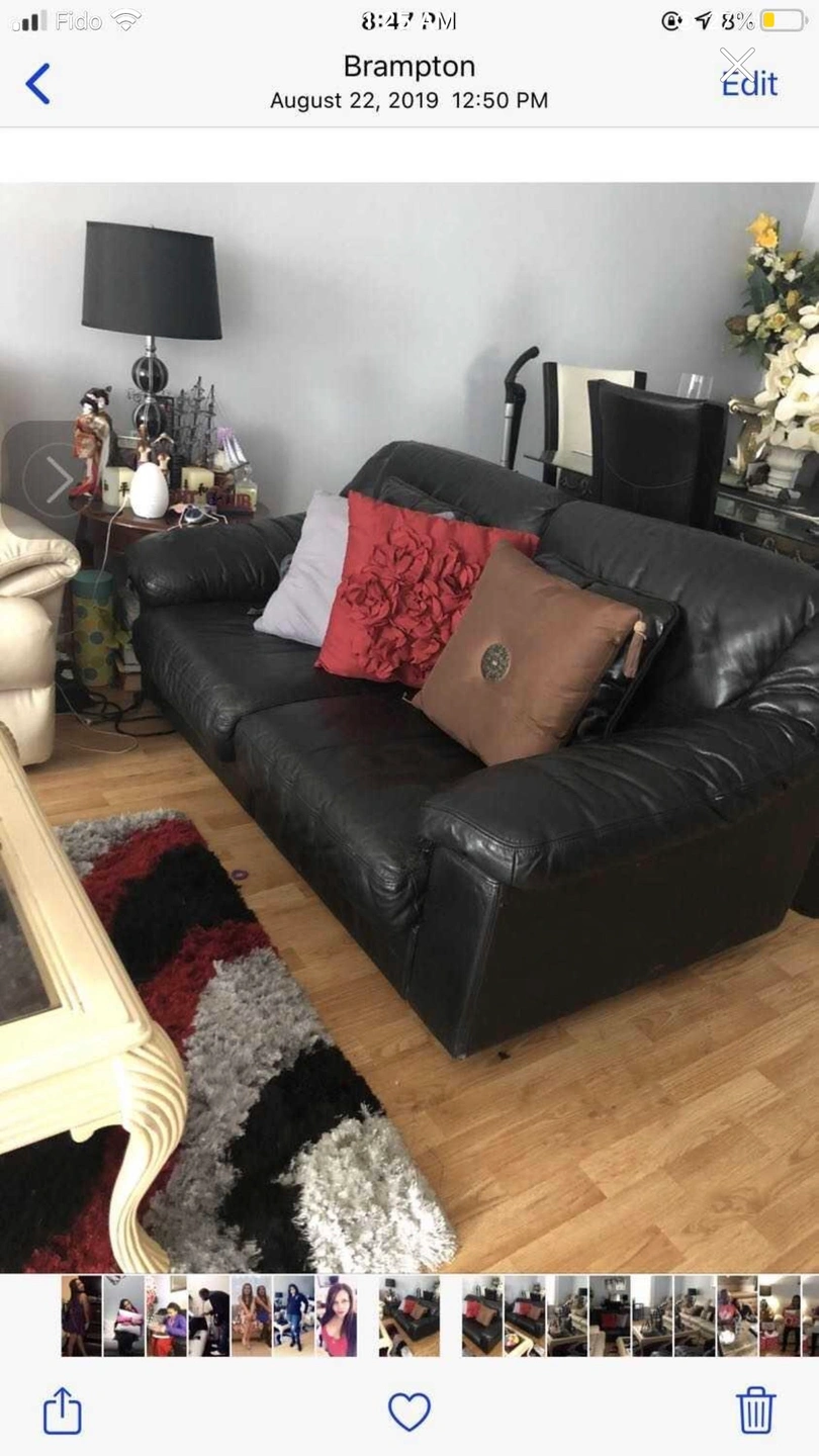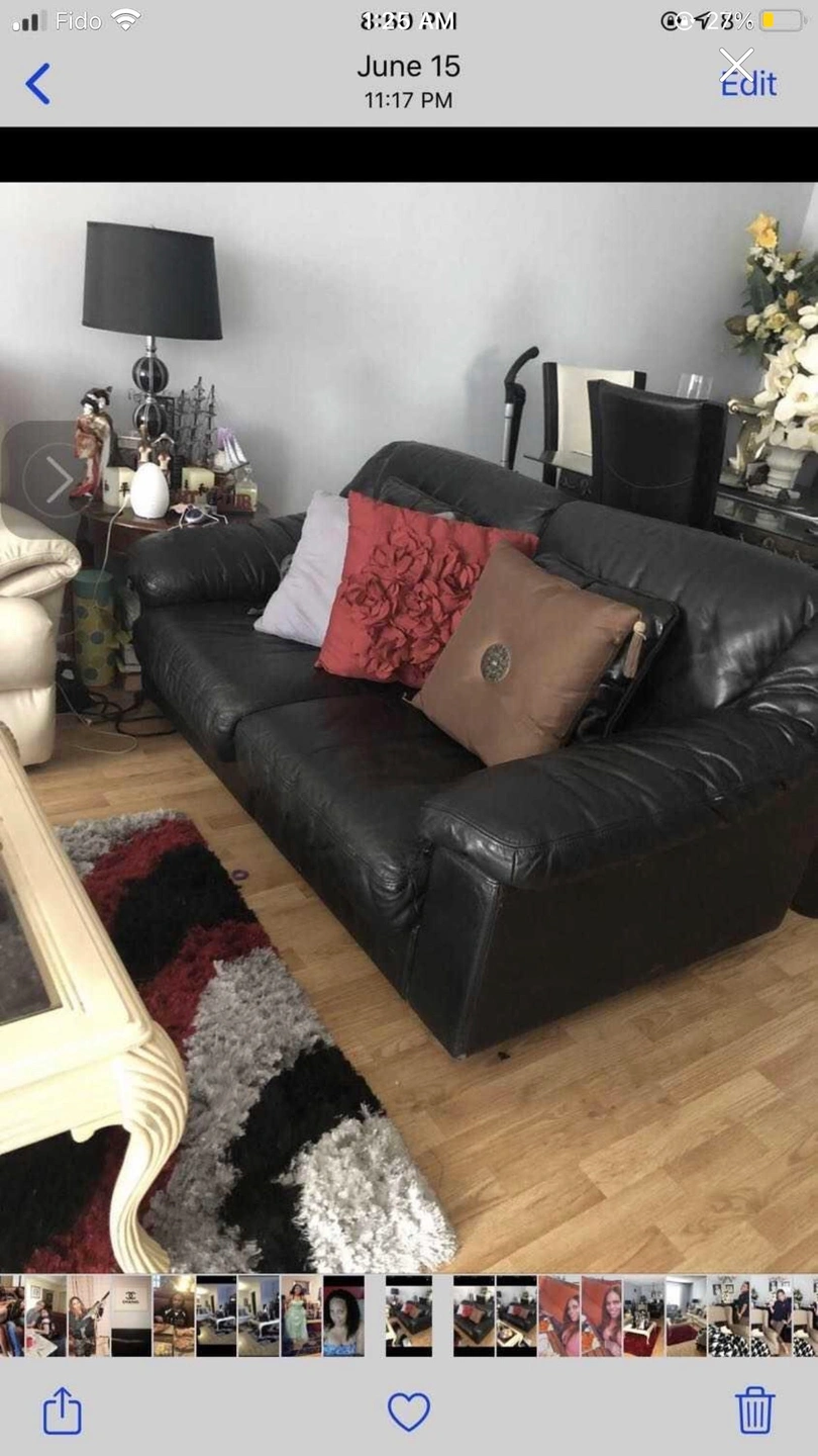 Black genuine leather sofa couch, front pieces slide out in lounge position. Very nice and cozy for smaller spaces, very strong leather, does not have a recliner foot rest but is very comfortable even to sleep in with its nice cushioned, cozy arms. A must buy at a very good price.