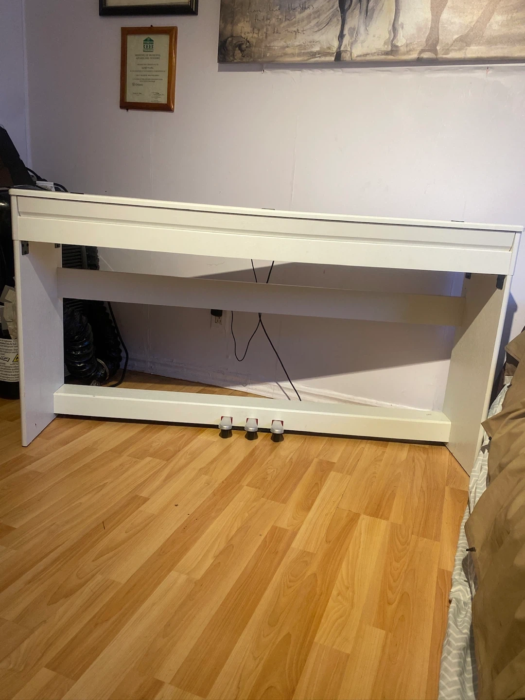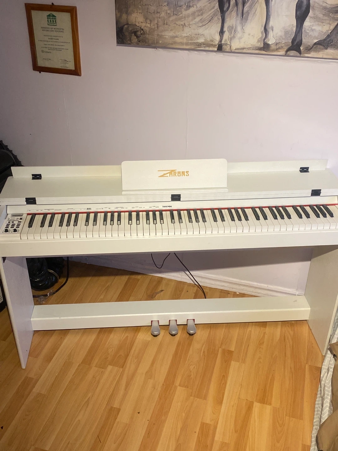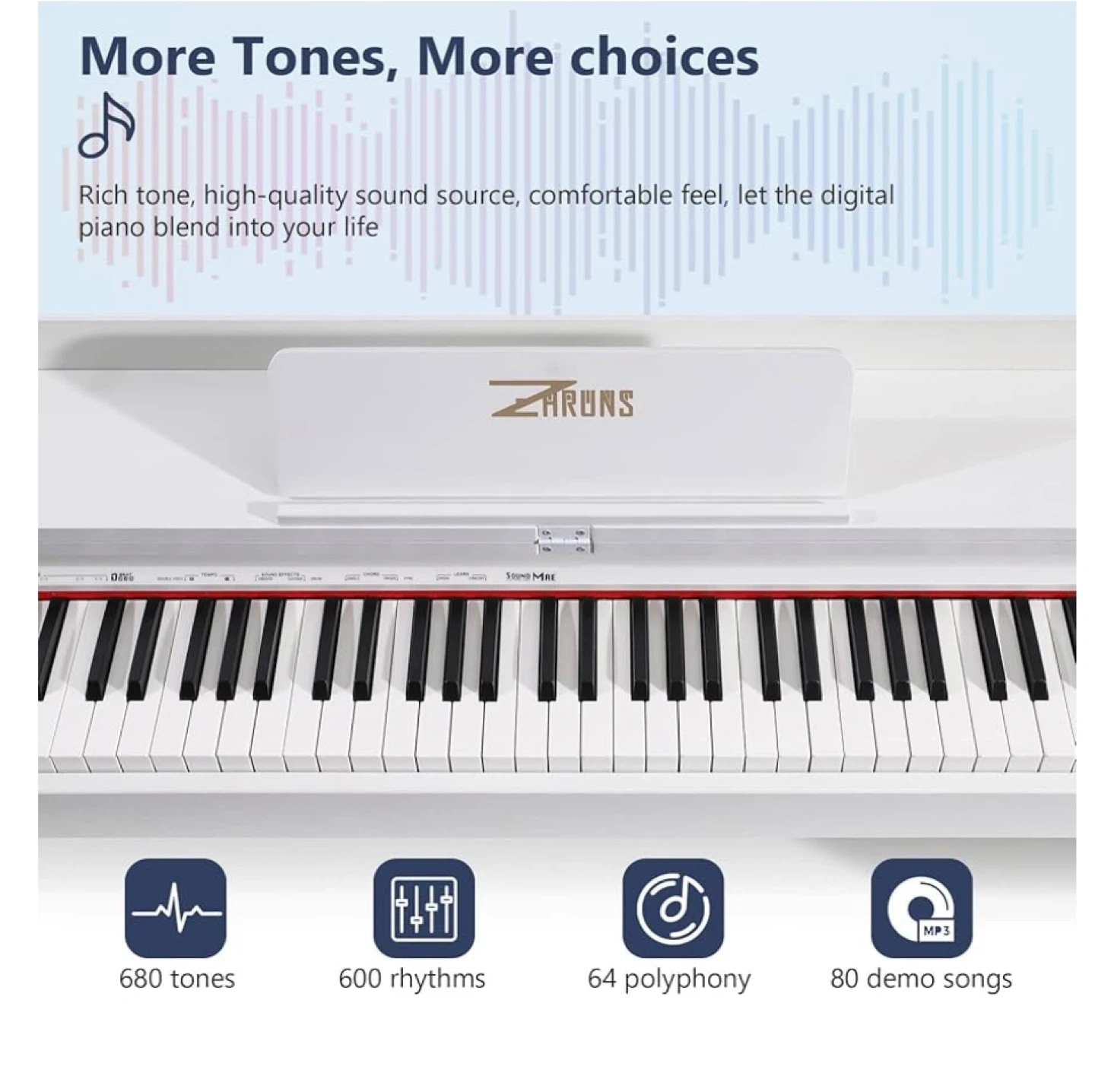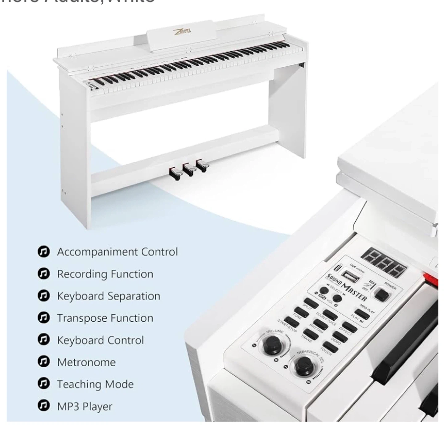 For sale is a ZHRUNS 88-key weighted digital piano, complete with a stylish white furniture stand. This piano is perfect for both beginners and experienced players, offering a realistic piano feel thanks to its weighted keys. It features a variety of sound options and recording capabilities, making it a versatile instrument for any musician.