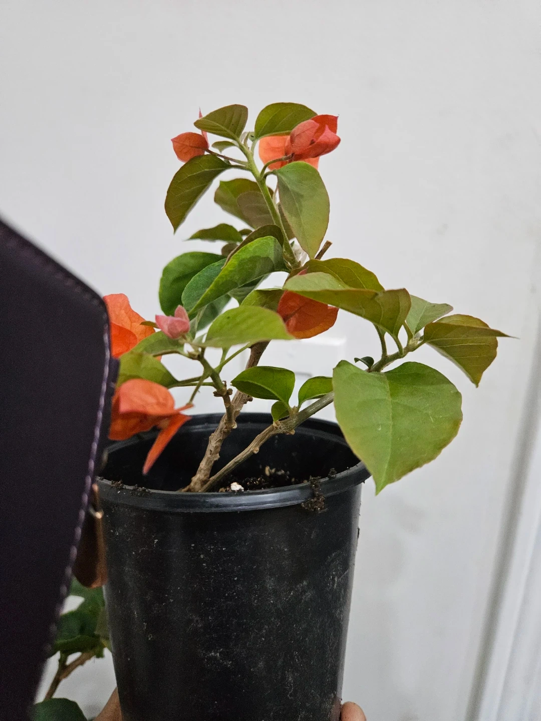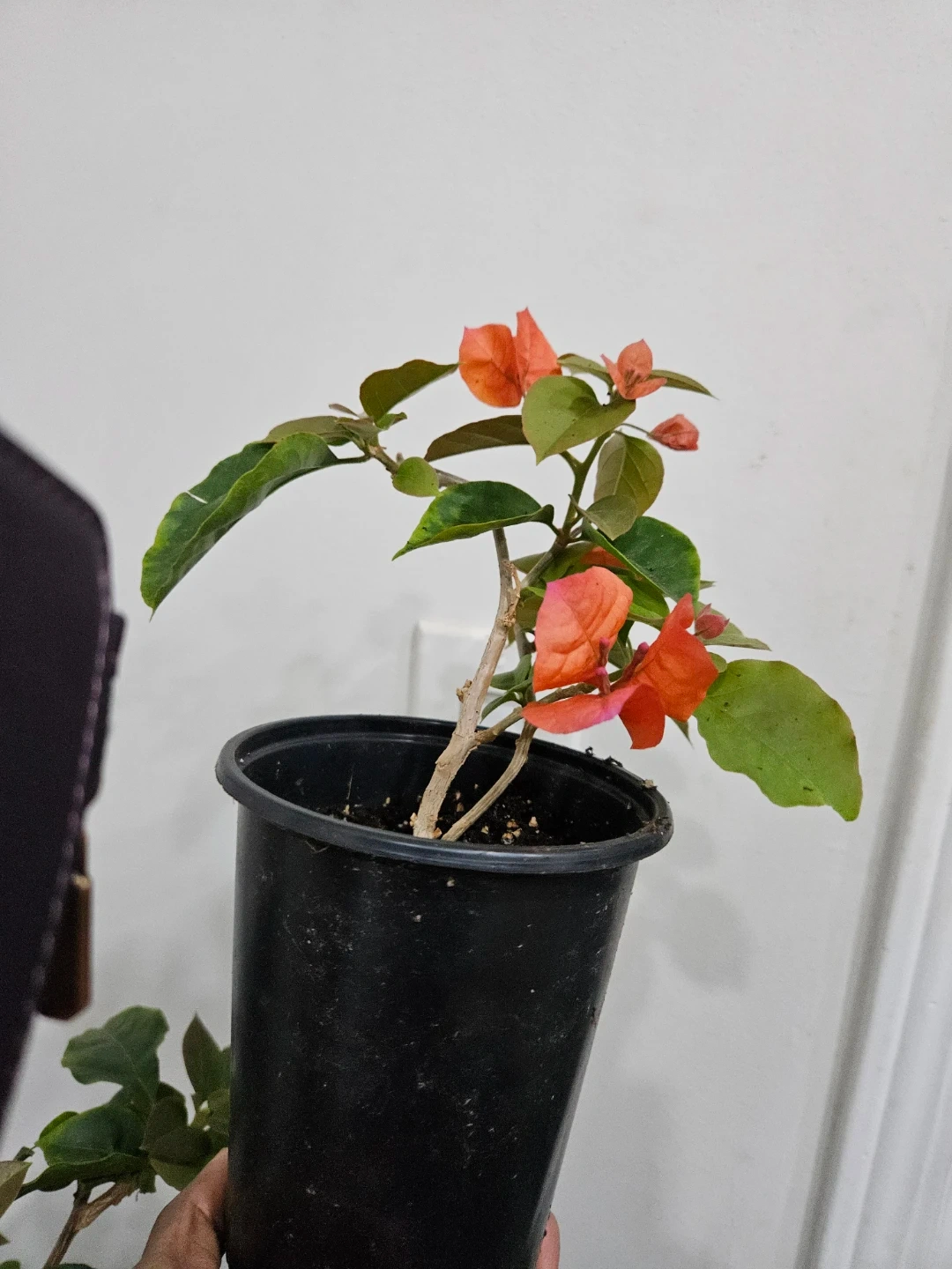A lovely bougainvillea plant potted in black. It's currently blooming with vibrant orange flowers and lush green leaves. This plant would bring a pop of colour to any home or garden!