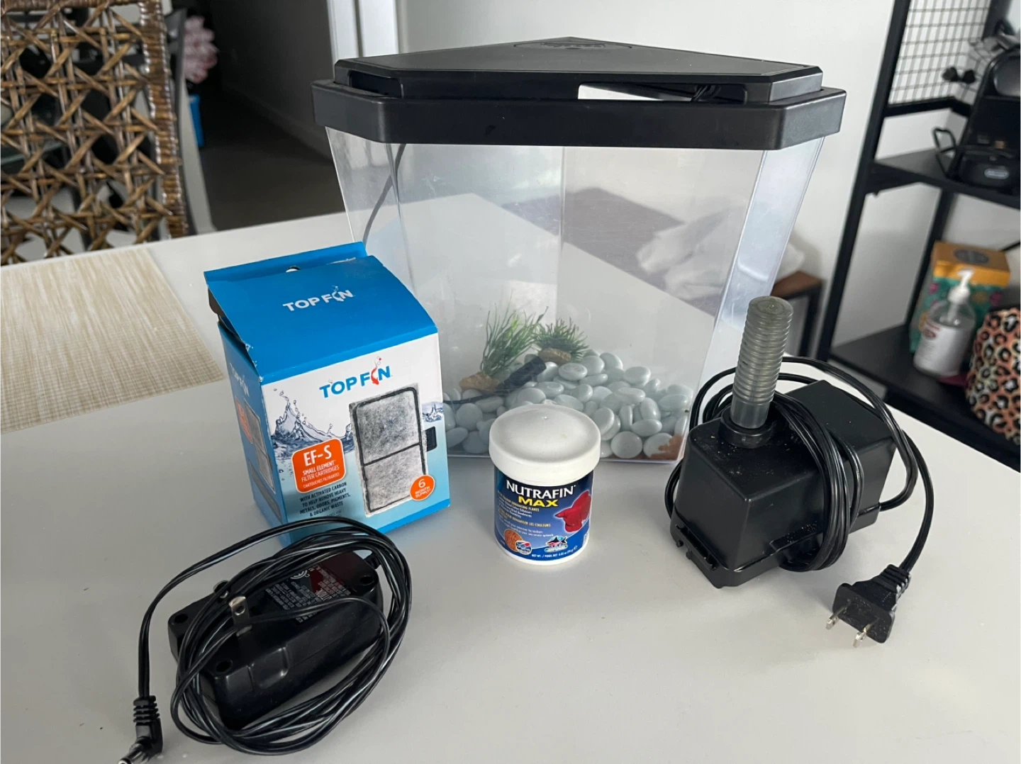 This is a TOP FIN 5-gallon aquarium starter kit. It includes a filter, power adapter, and Nutrafin Max fish food. This setup is perfect for beginner fish keepers!