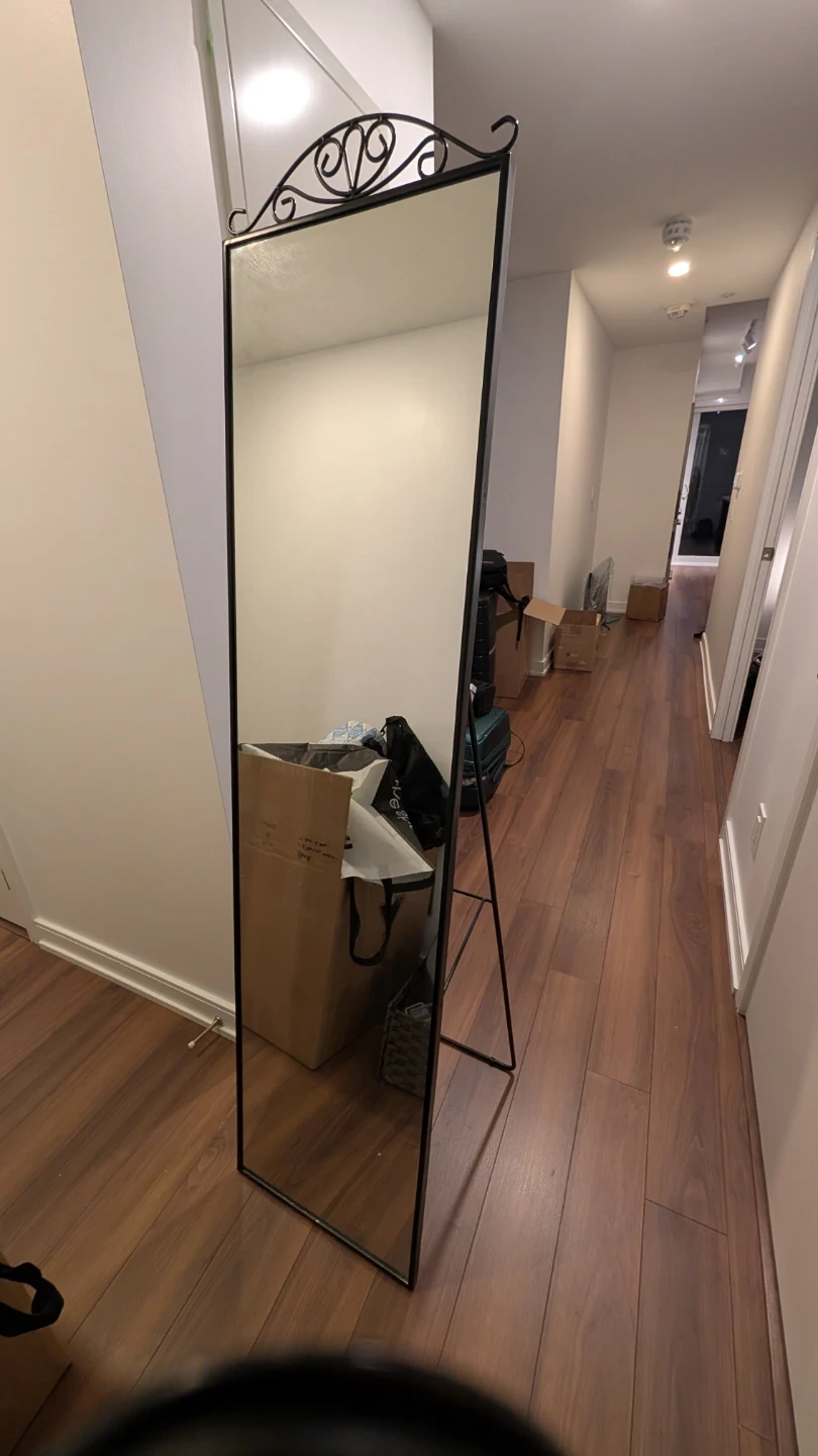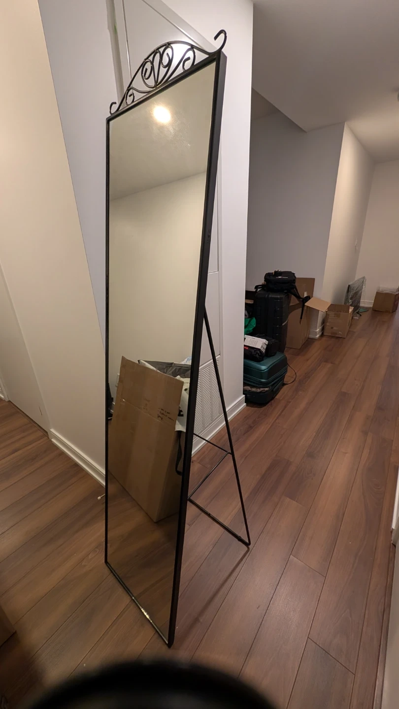 Selling to make space. A tall, black framed standing mirror from IKEA used for less than a year. Its decorative top adds a nice touch. It's easy to move and place where you need it.