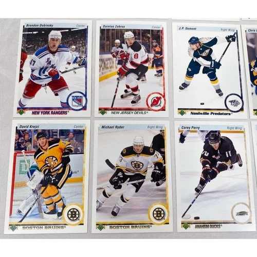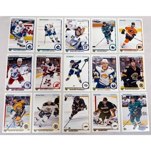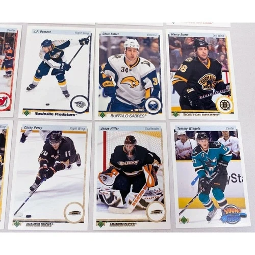 Lot of 15 cards from the 2010-2011 Upper Deck 20th Anniversary set, including parallels and Young Guns. Cards included are: Mikael Samuelsson #11, Mason Raymond #12, Martin St-Louis #22, Dan Boyle #35, Ville Leino #58, Brandon Dubinsky #71, Dainius Zubrus #82, J.P. Dumont #91, Chris Butler #174, Marco Strum #180, David Krejci #184, Michael Ryder #185, Corey Perry #195, Jonas Hiller #197, and Tommy Wingels Young Guns #243. Each card is shipped in a penny sleeve and top-loader.