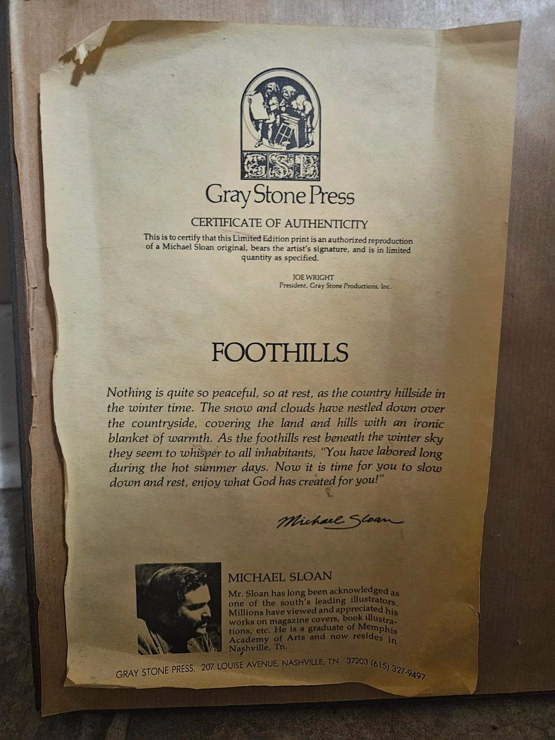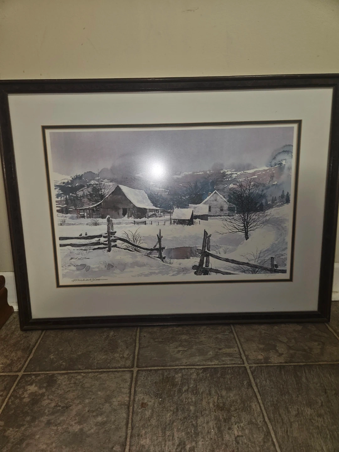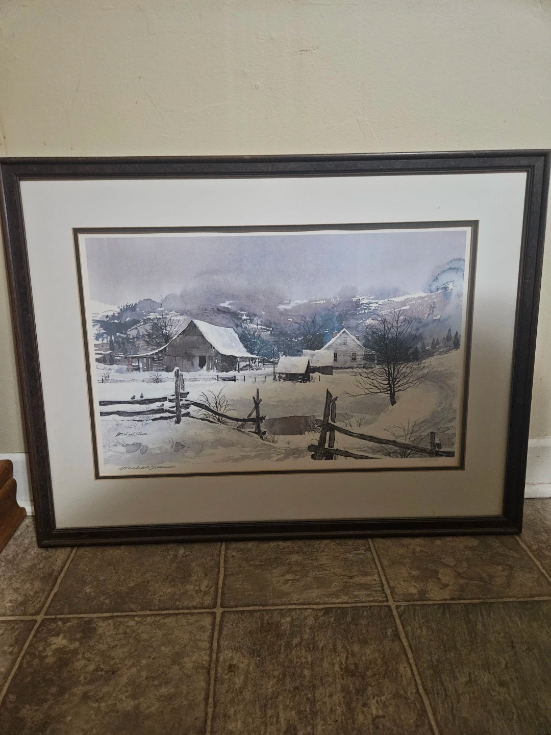 This is an authorized reproduction of a limited edition by Michael Sloan titled "Foothills". The print depicts a serene winter farm scene. It comes with a certificate of authenticity from Gray Stone Press.