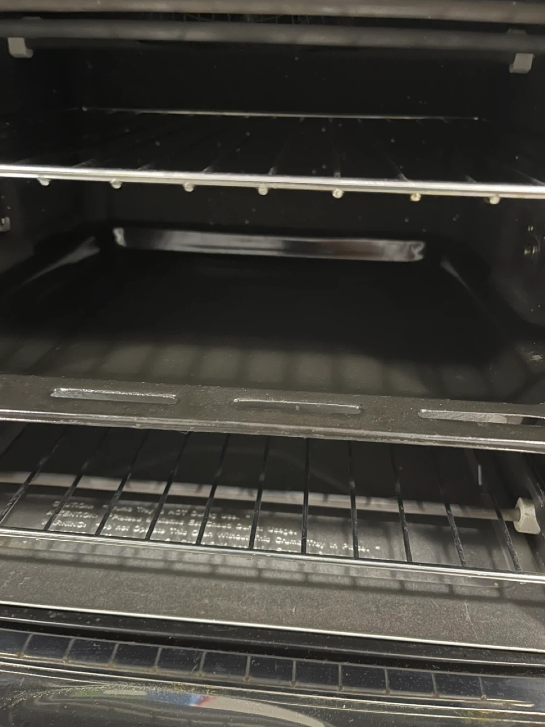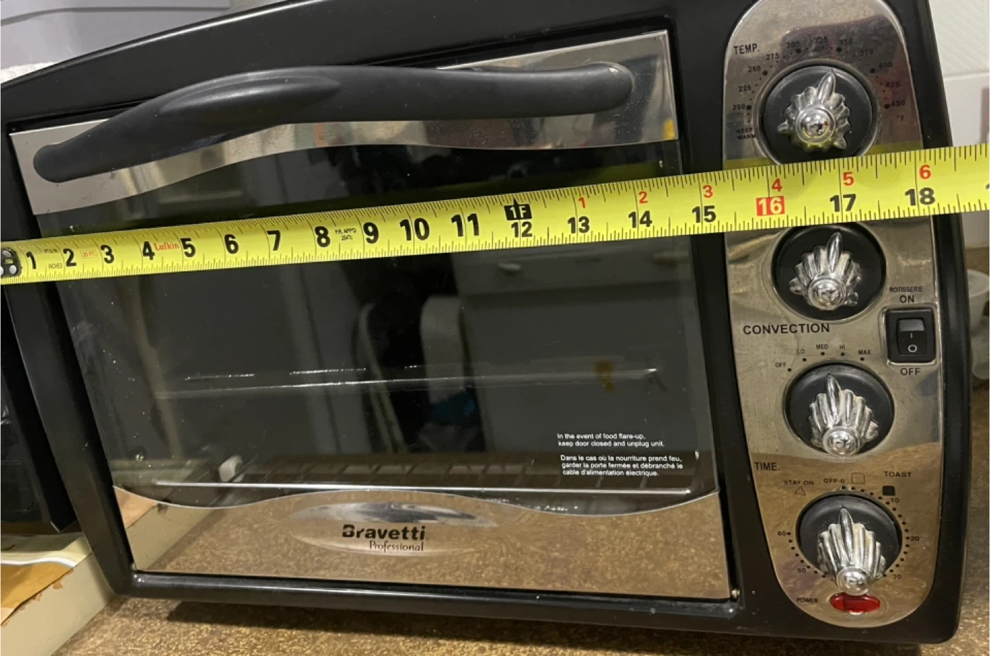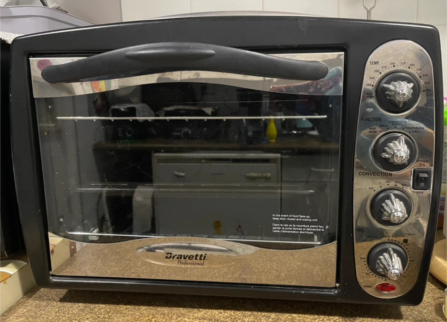 This Bravetti Professional toaster oven is black and silver. It includes multiple racks and a crumb tray. It has convection settings and a timer.