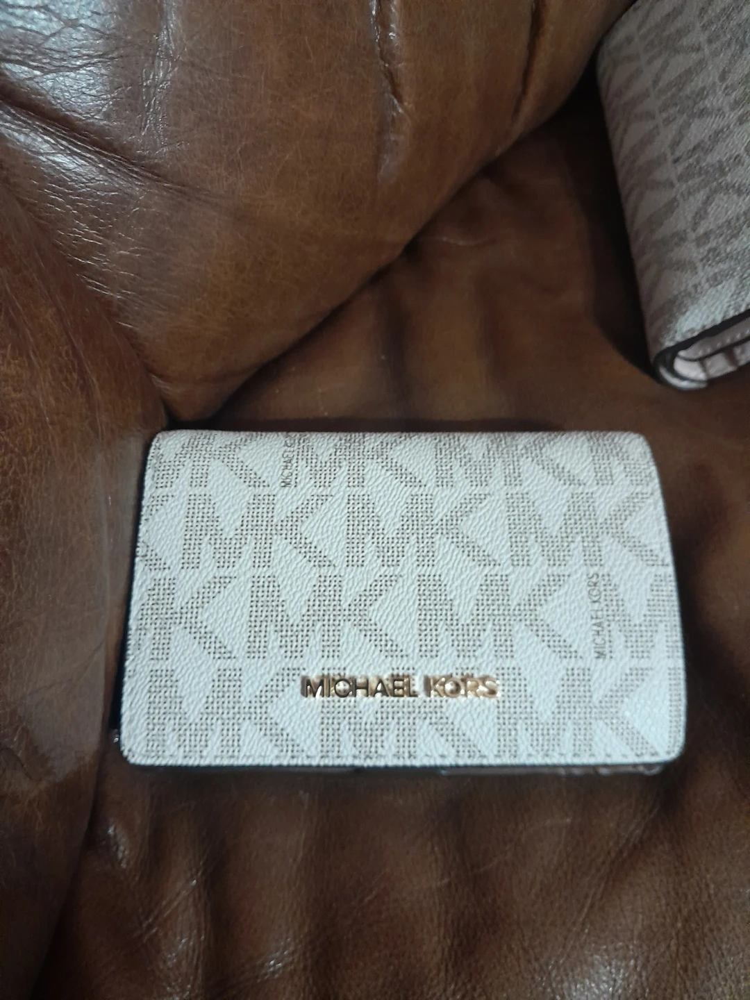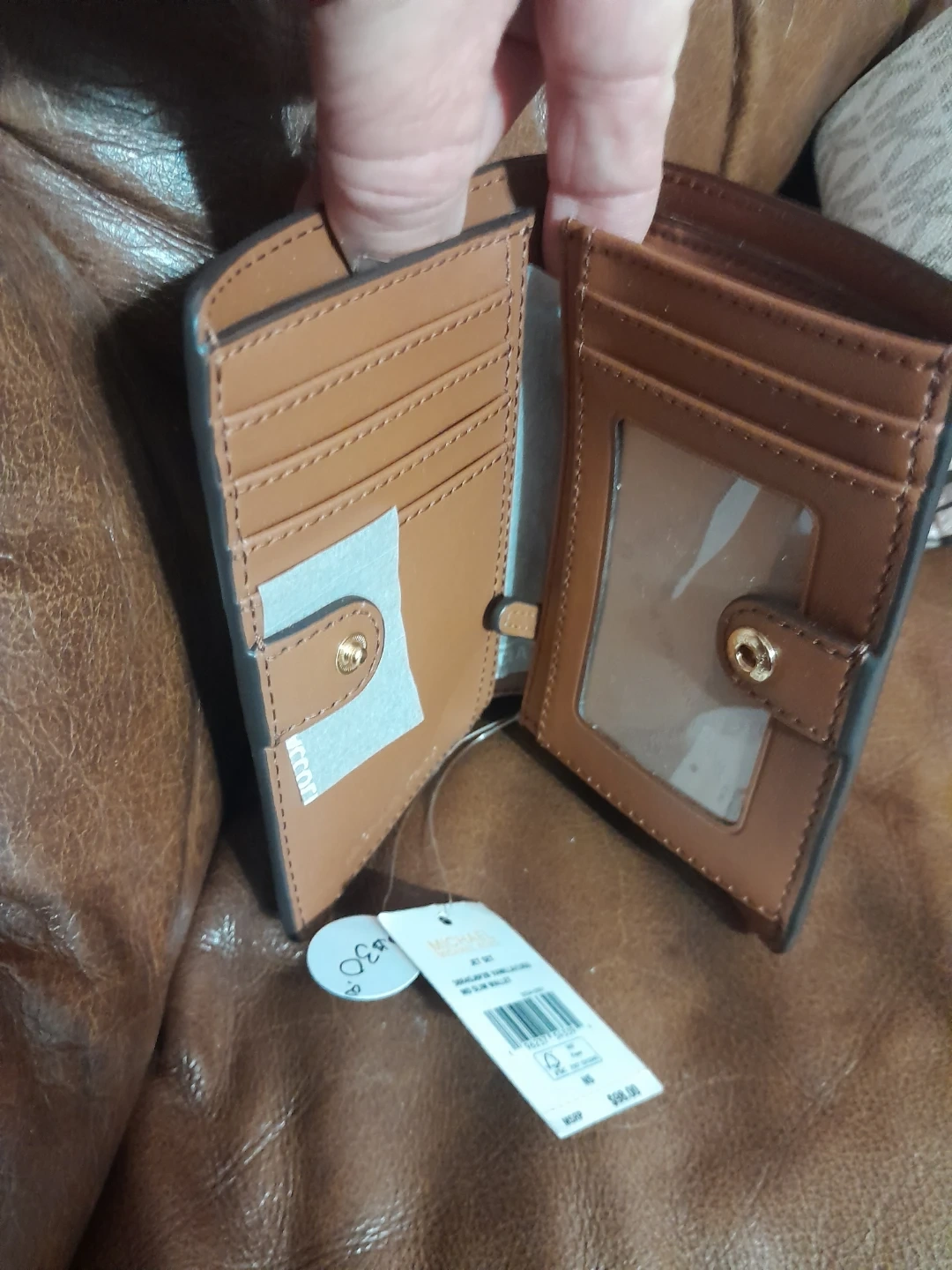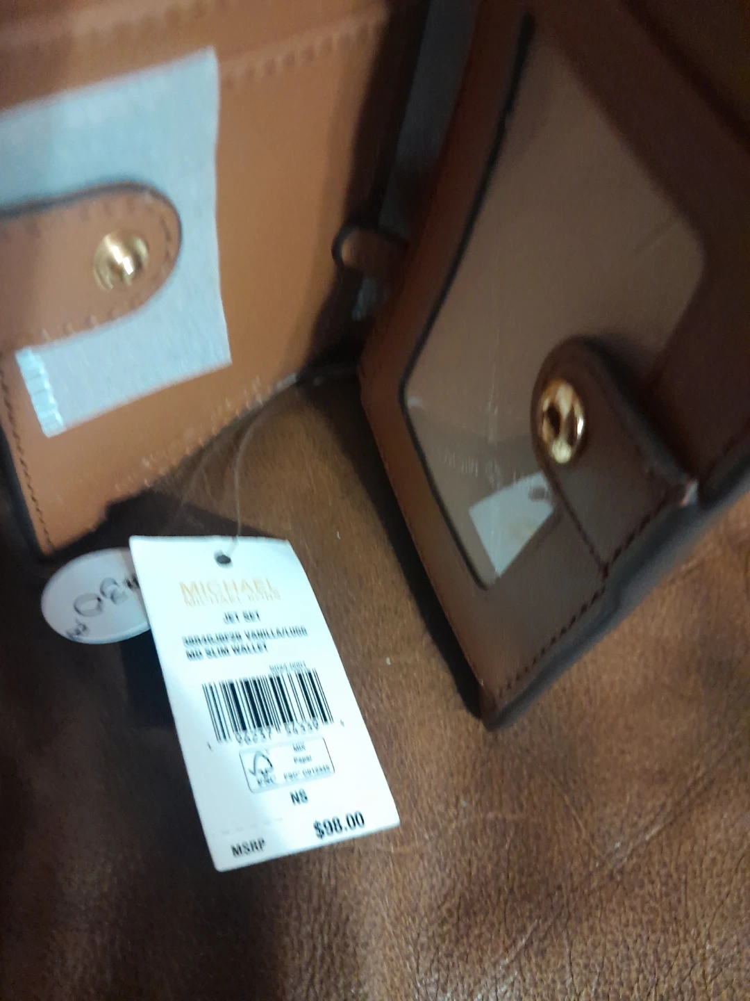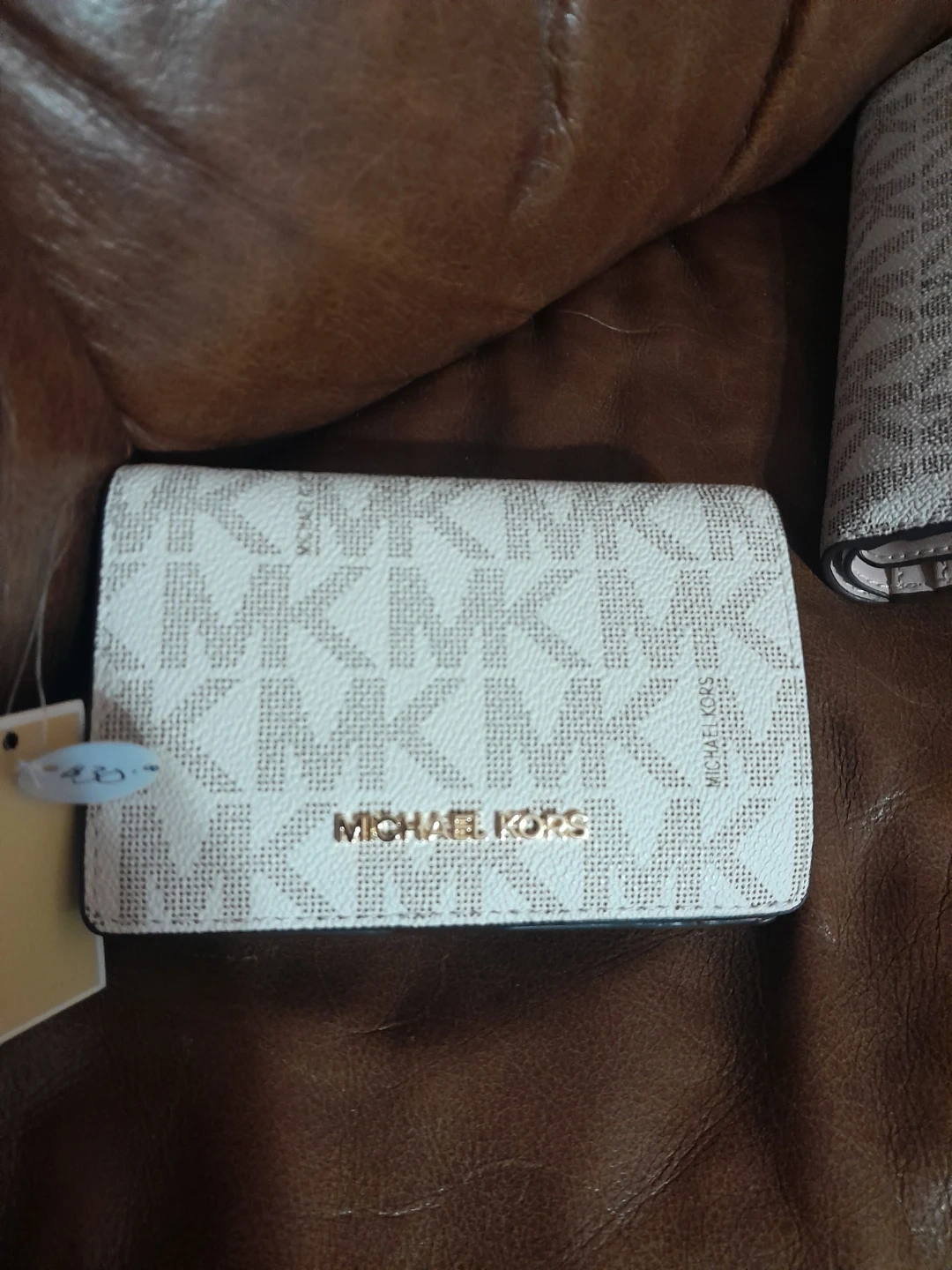Michael Kors Jet Set wallet in vanilla and luggage color. This compact wallet features the MK signature print. It has multiple card slots and a clear ID window. Comes with original tags attached. 9 card pockets, 1 ID pocket, 2 bill fold pockets zipper pocket, 5" long, 3 1/2" high, brand new with tags retails$98.00 your choice $30.00
