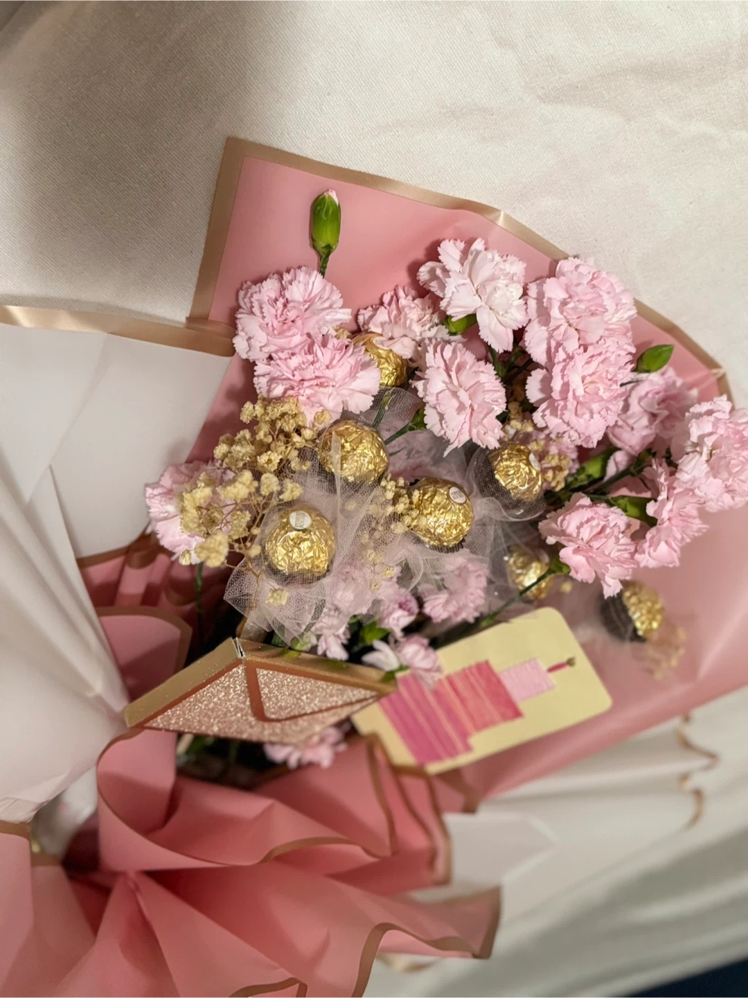 A lovely bouquet featuring pink carnations and Ferrero Rocher chocolates, all wrapped with decorative pink and white paper and a gold ribbon. It includes a small decorative tag. This would make a sweet gift for someone special!