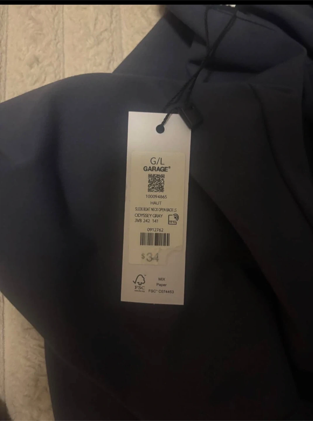 This is a long sleeve boatneck top from Garage in Odyssey Gray. It's a size L and features an open back design. It’s brand new with tags and originally bought for $35.