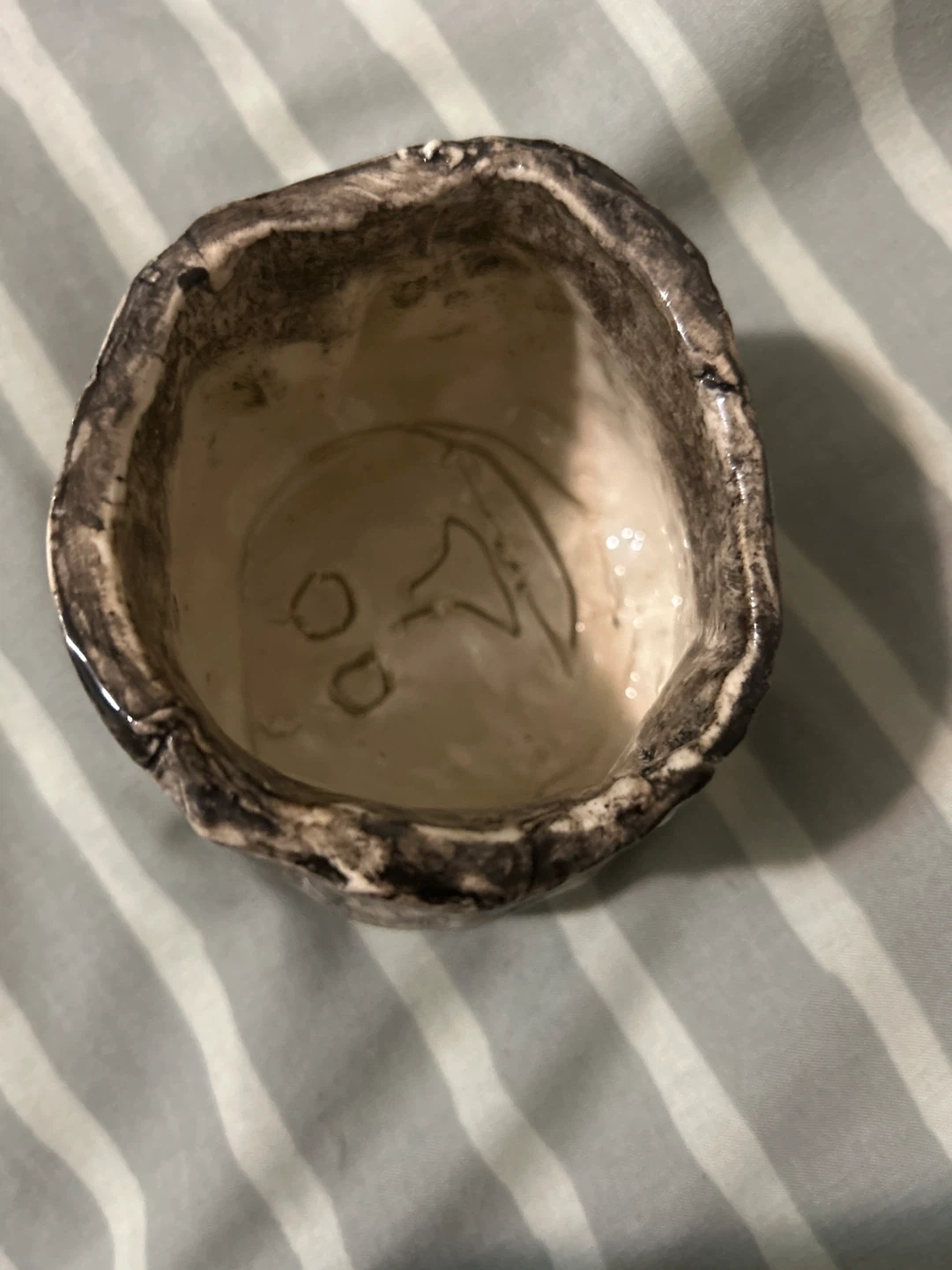 A unique, handmade ceramic pot with a rustic, earthy finish. The inside has a simple face design. It's approximately 4 inches tall and 4 inches wide. Made by me.