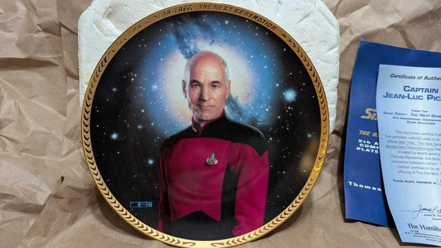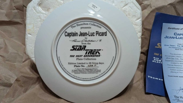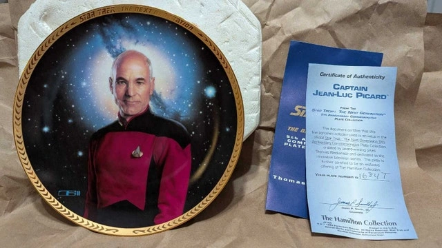 Beam aboard this Star Trek: The Next Generation collector plate featuring Captain Jean-Luc Picard, a must-have for any discerning Trekkie! This limited edition plate from The Hamilton Collection is in good condition and ready to boldly go where no plate has gone before. Why not add this to your collection? It comes with a certificate of authenticity. If this ad is still up, the plate is still available!
