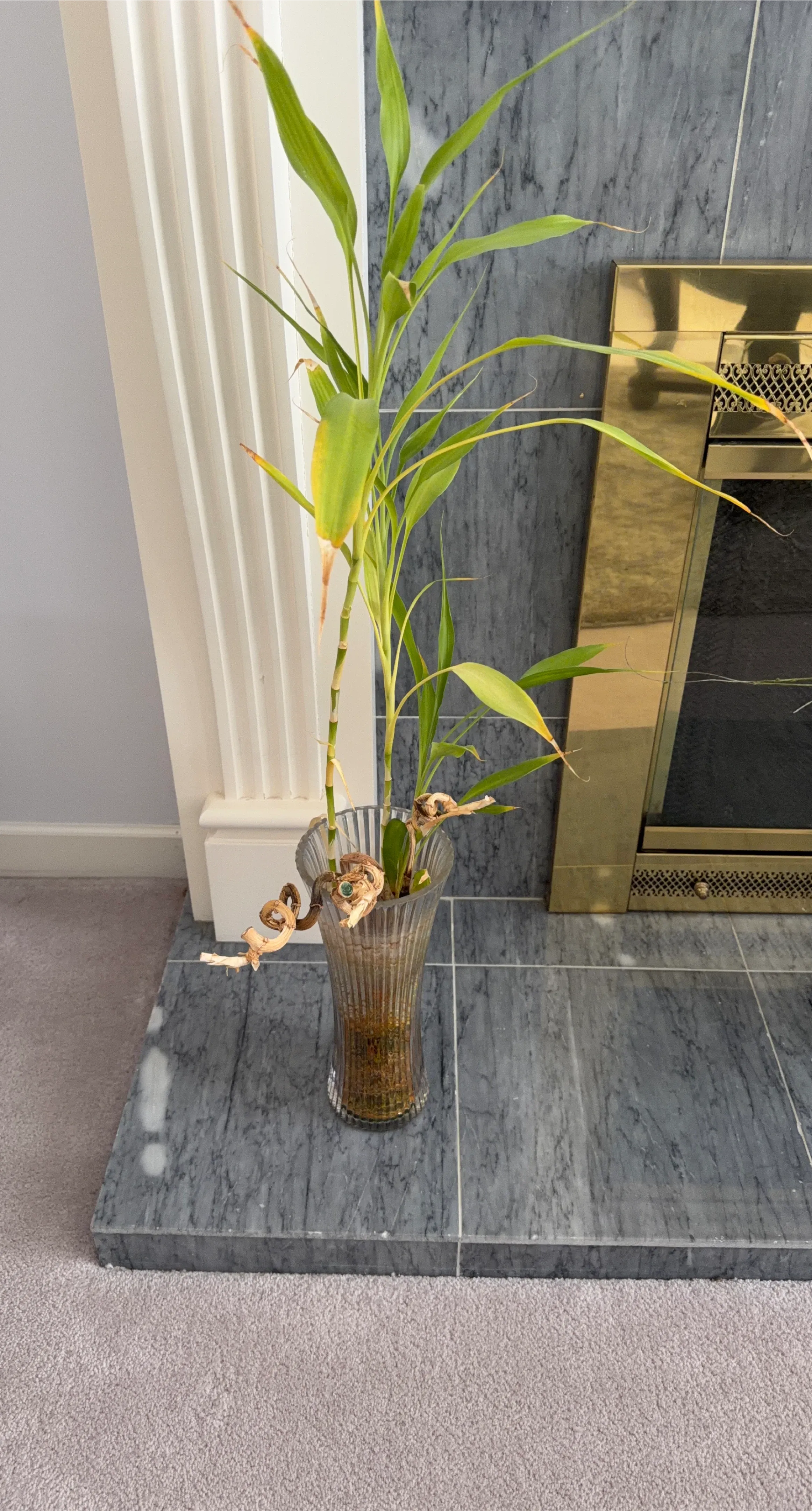 A vibrant lucky bamboo plant is beautifully presented in a fluted glass vase. It's a charming addition to any space! This plant thrives in water and is known for its elegant, sculptural stalks.