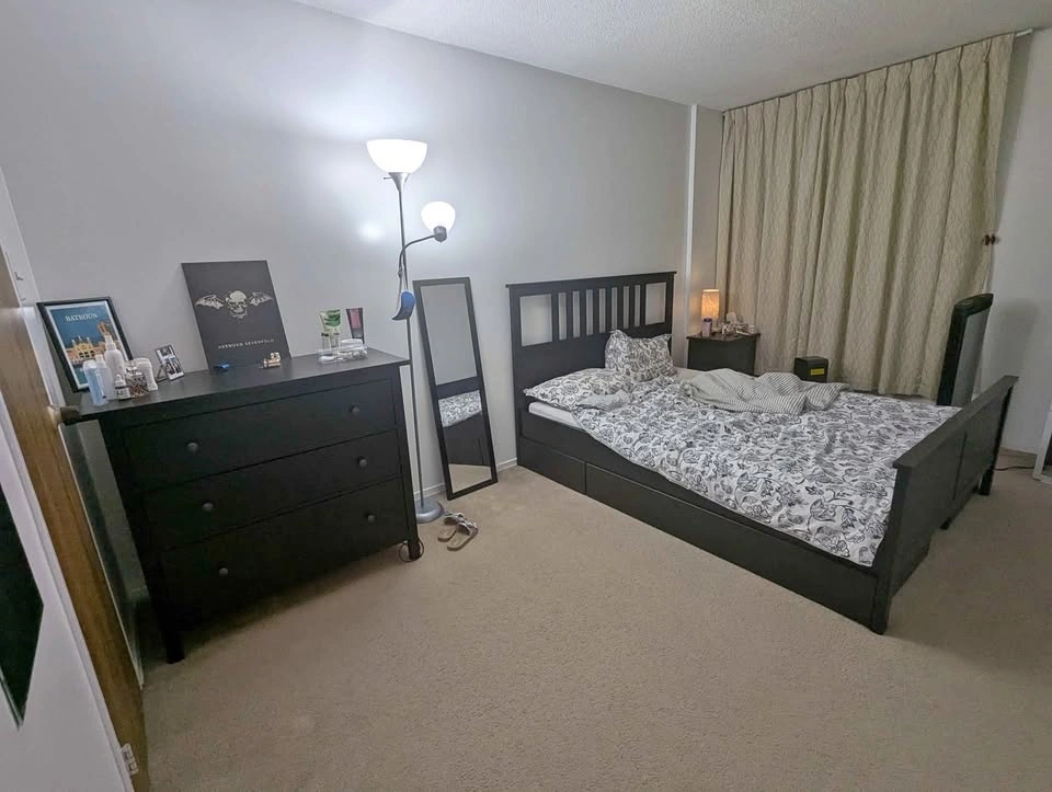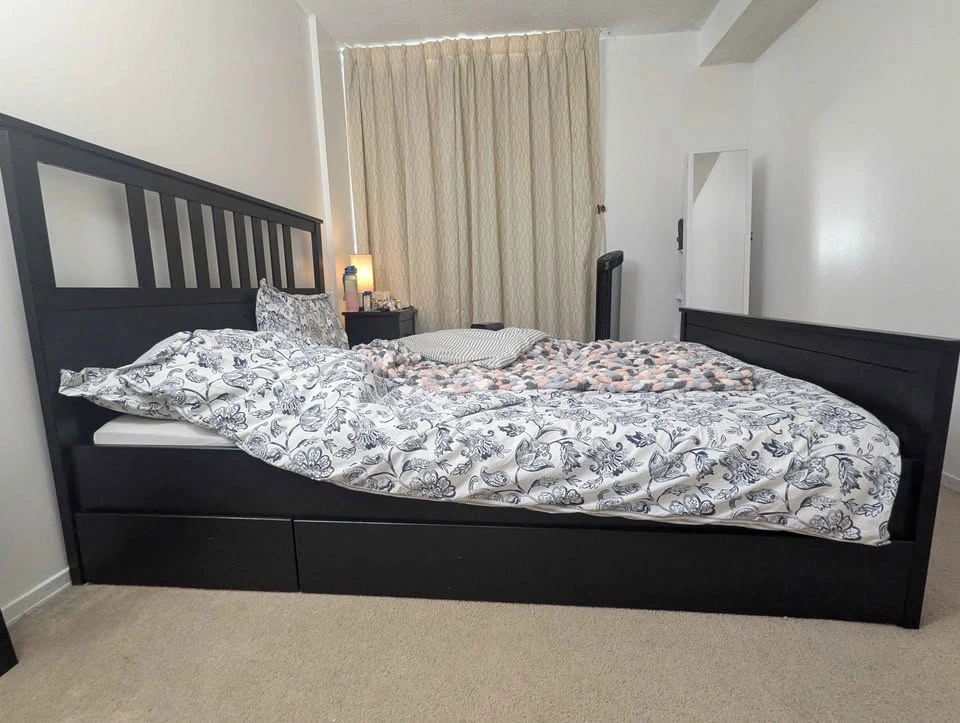 Bed has 3 storage drawers. Queen Bed with slats. Pick up only. If you want the mattress and bed sheets and duvet and pillows Etc. I can give you a deal for $750 total.
