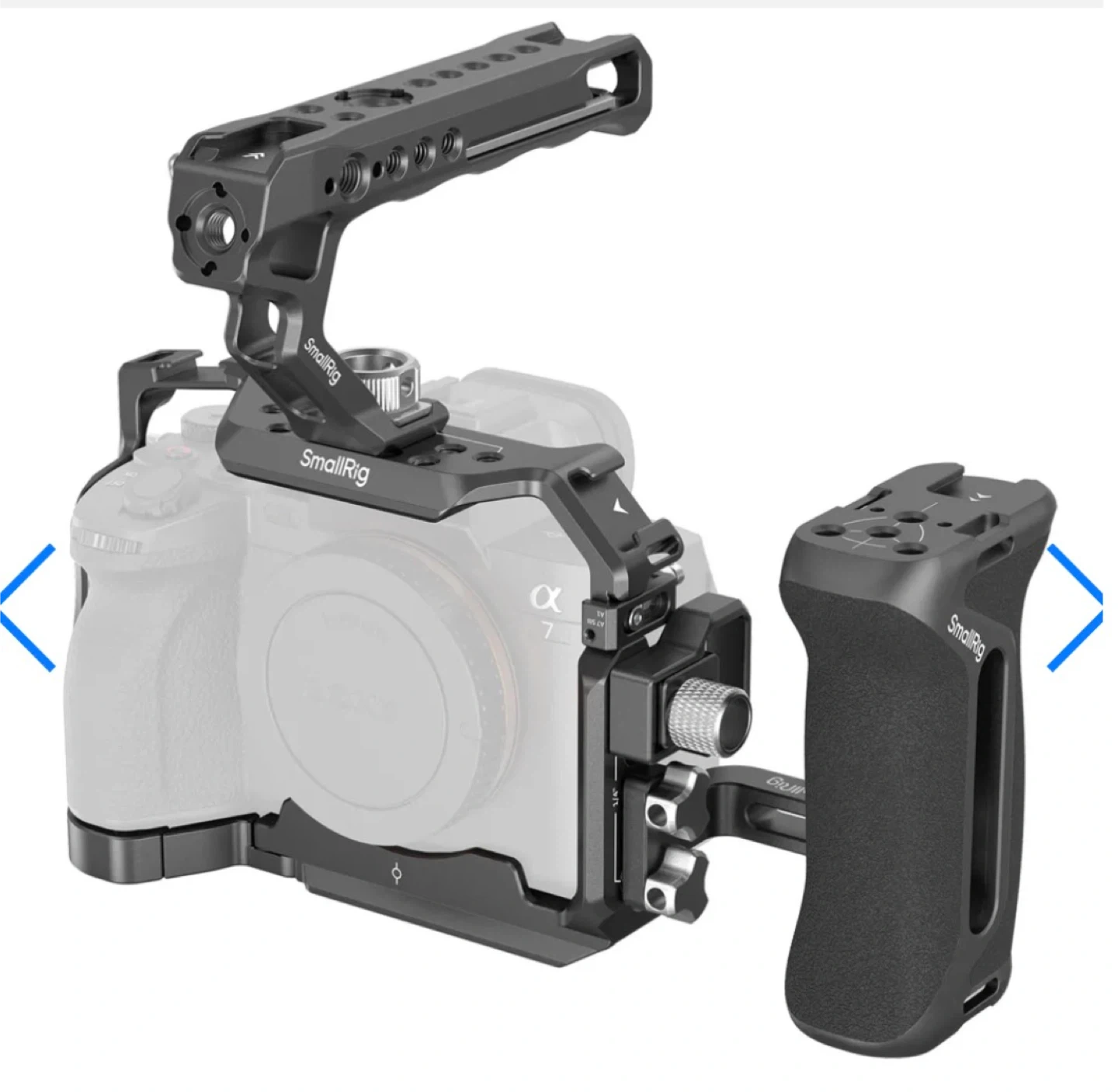 This is a SmallRig advanced cage kit designed for Sony Alpha 7R V, Alpha 7 IV, and Alpha 7S III cameras. It provides a secure mounting solution for camera accessories and improves handling. Aluminum alloy construction.