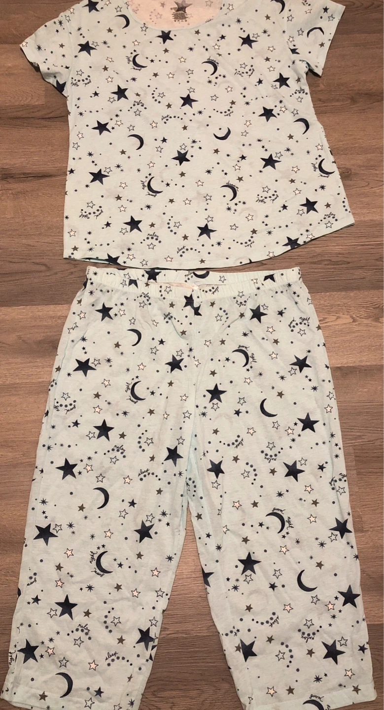 Pyjama set with a celestial print. Includes a short-sleeved top and matching pants. Fabric is soft and breathable for comfortable sleep.