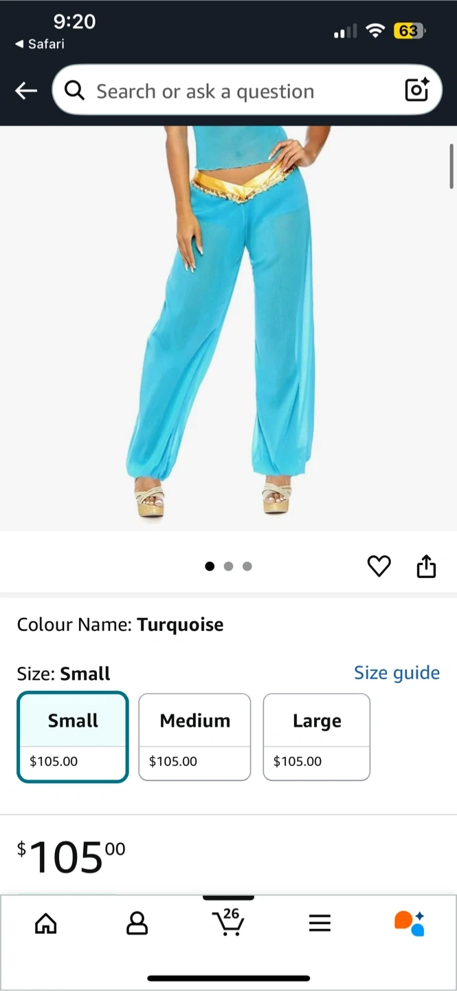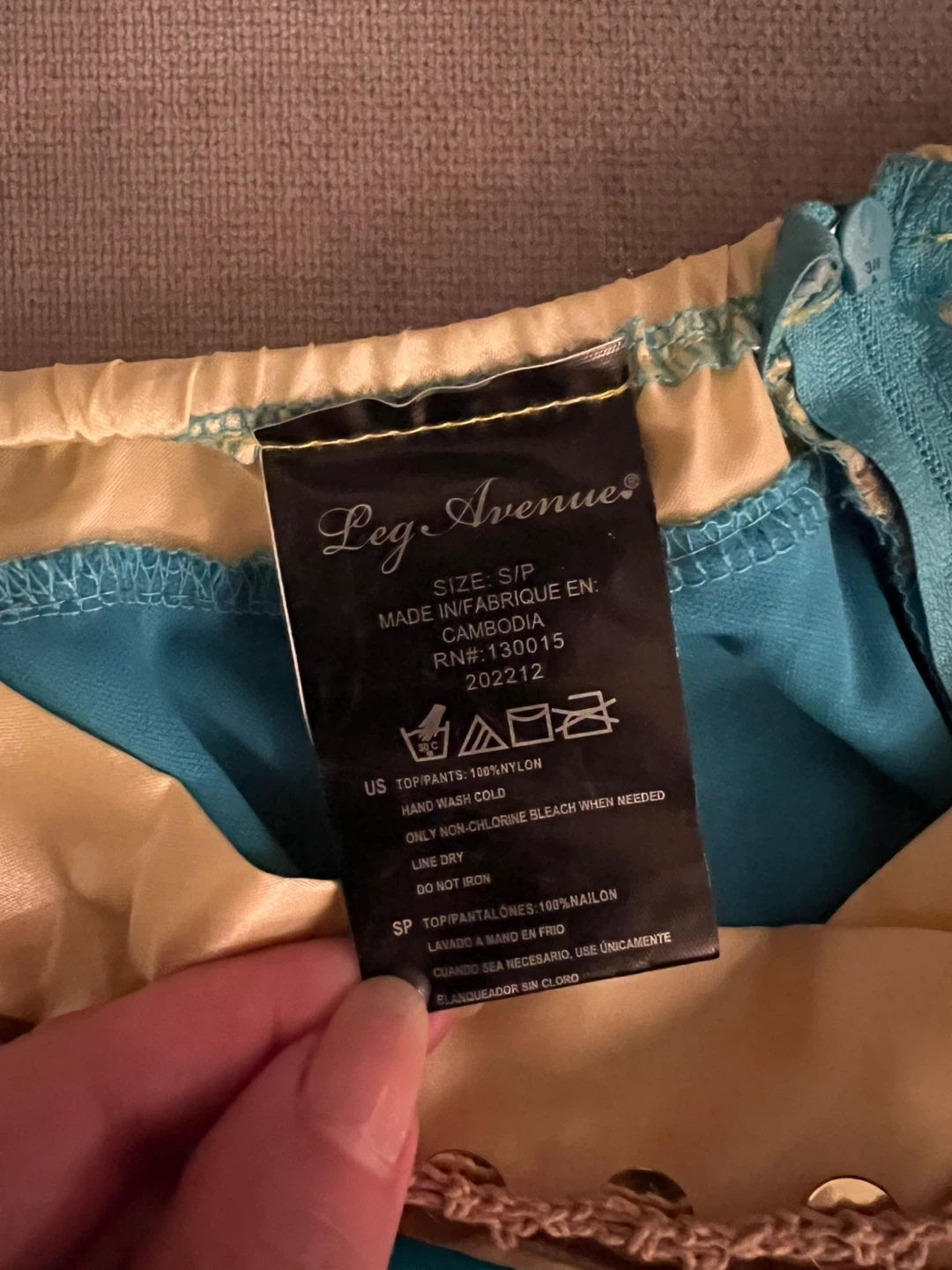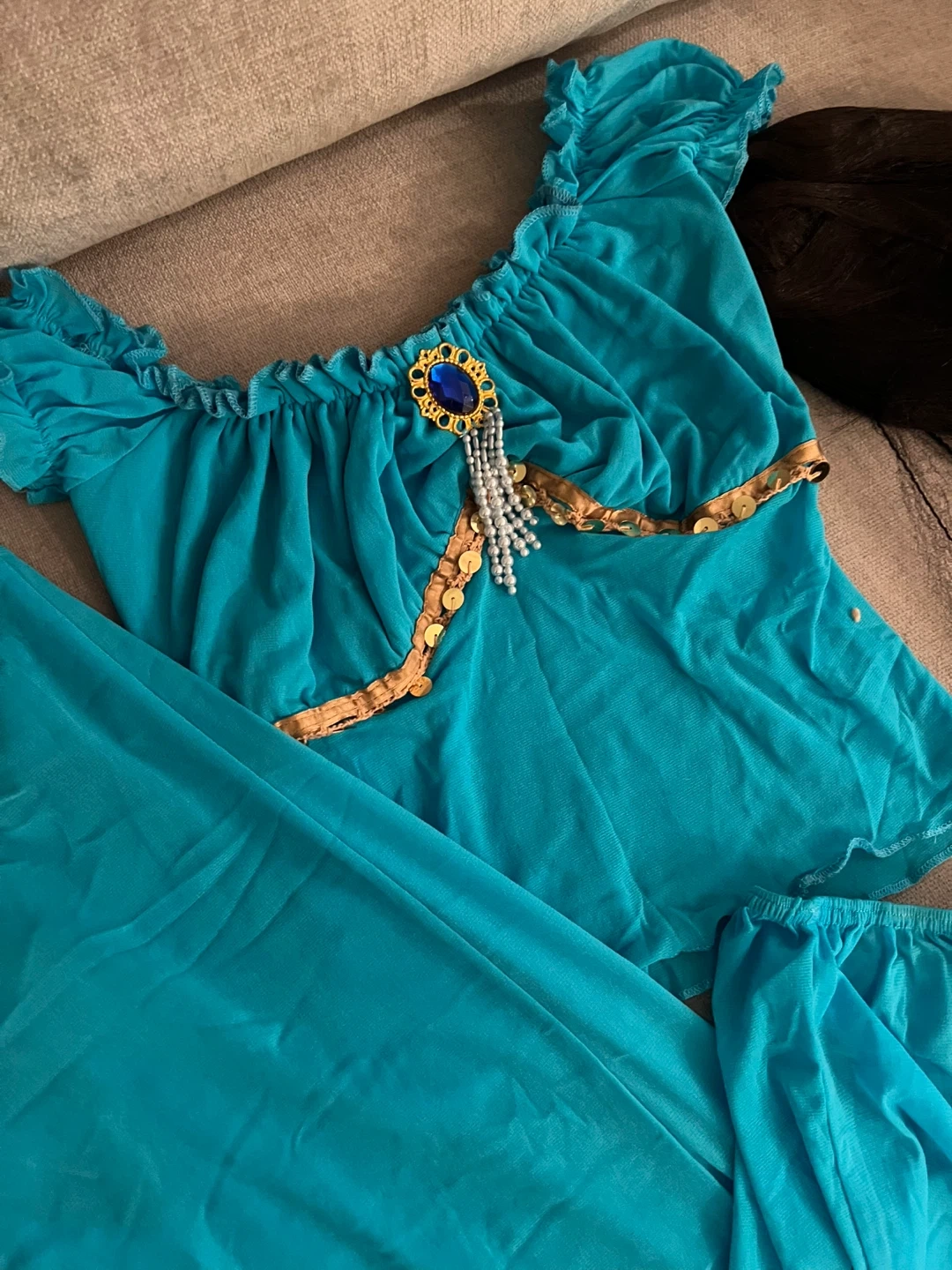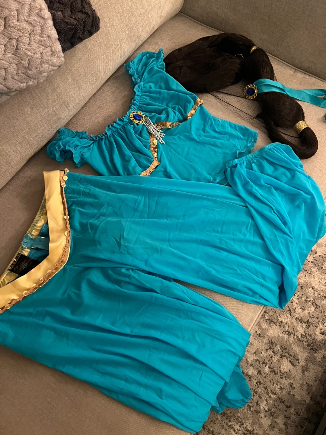 Jasmine costume in size small! It's a beautiful turquoise colour and includes the top, harem pants, and a headband with a wig. The material is 100% nylon. Originally bought for $105