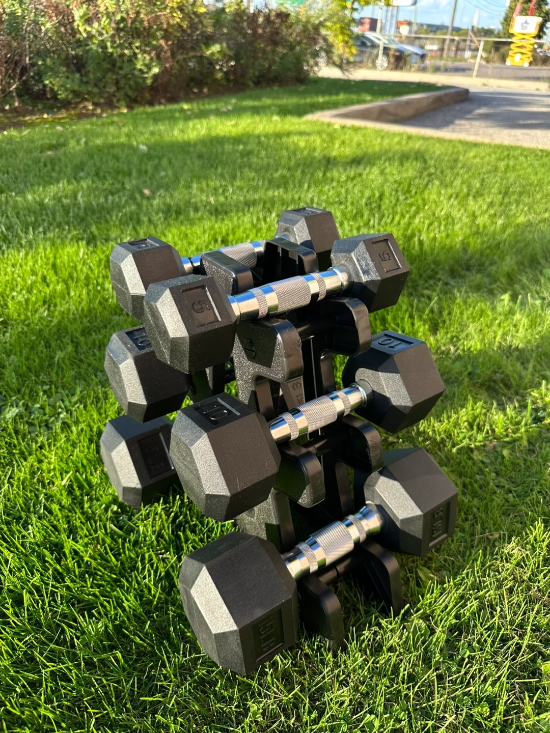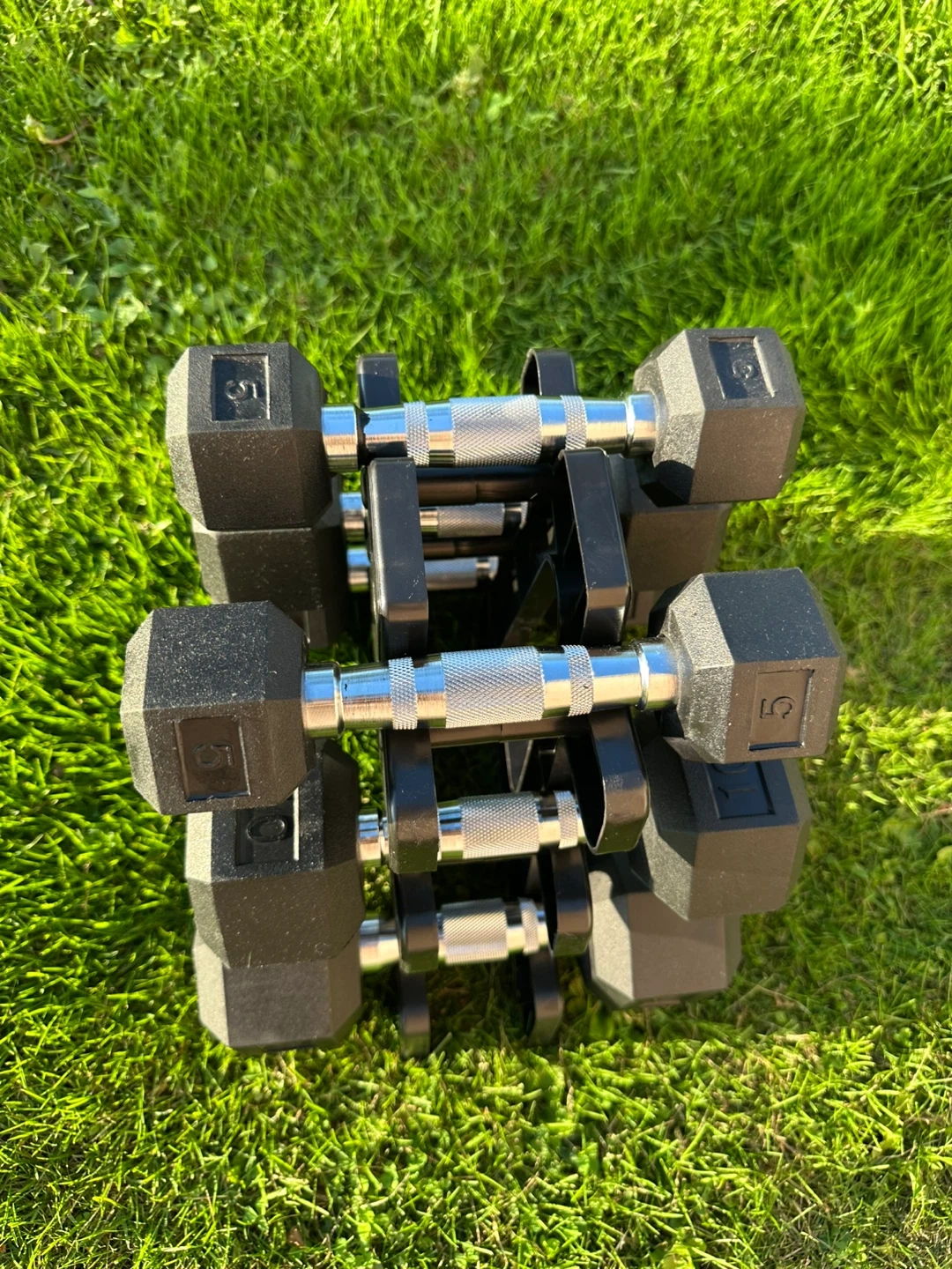 Hex dumbbell set with a handy rack for storage. Includes weights of varying sizes. Chrome handles provide a comfortable grip.