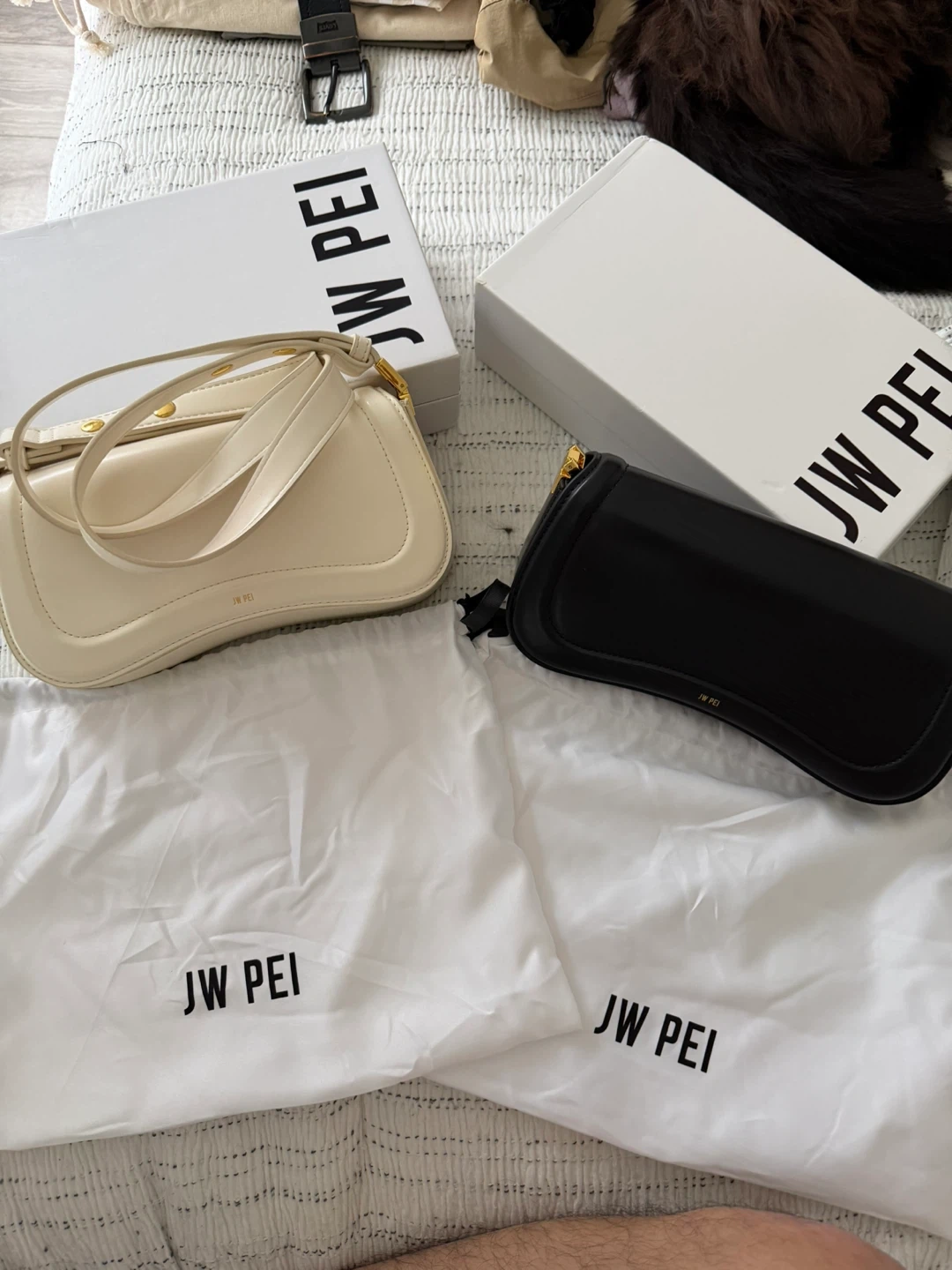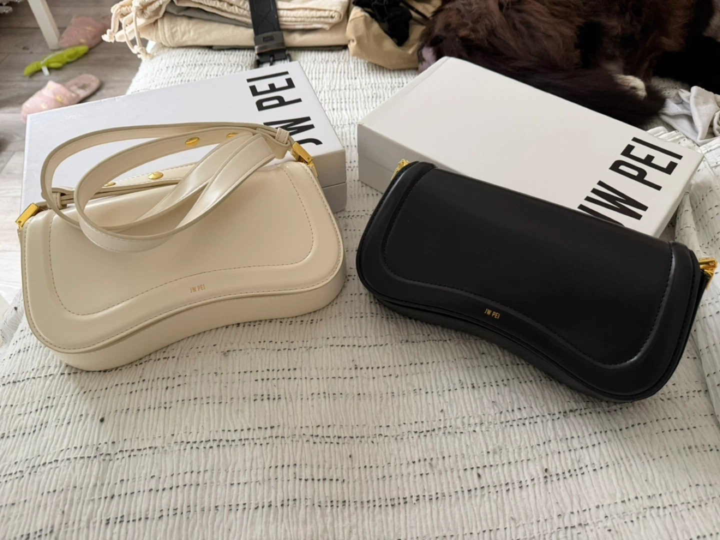 Two JW Pei shoulder bags, one in black and one in cream. Includes original boxes and dust bags. Leather material. Never used