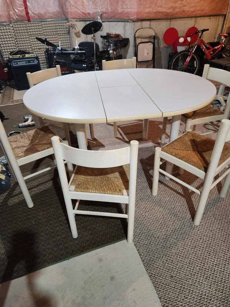 White oval dining table with two leaves. Six coordinating chairs with woven rush seats. Good condition. Table expands for larger gatherings. made in Italy very solid it has a pull out extension on 13 inches