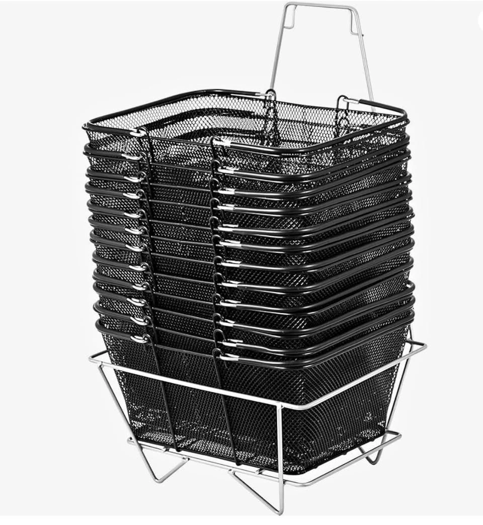 10Selling a complete set of 12 black metal wire mesh shopping baskets with handles, along with the dedicated basket stand. This set is essential for any small retail store, grocery, convenience store, or pop-up shop looking to offer customers an easy way to shop. Price: $120.00 (Cash only) Condition: Excellent Condition. Ready to be put to work! Quantity: 12 Baskets included. Bonus: Comes with the Basket Stand for neat and organized storage near the entrance. Material: Durable Black Metal (Steel Wire Mesh). Size (Each Basket): 16.1 in L x 12.2 in W x 7.1 in H (41 x 31 x 18 cm). Features: Portable, sturdy, and designed for easy stacking on the included stand. Pickup only. If this ad is still up, it is still available.