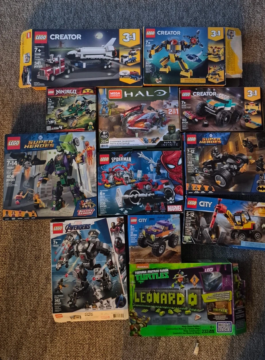 60Selling a collection of Lego sets including Creator, Ninjago, Avengers, Spiderman, Halo, Super Heroes, City, and Teenage Mutant Ninja Turtles (TMNT). All sets appear to be complete and in good condition! Great for kids aged 5+ All sets open box used with instructions. 95-100% pieces there. Selling in seperate adds or discount as a bulk buy.