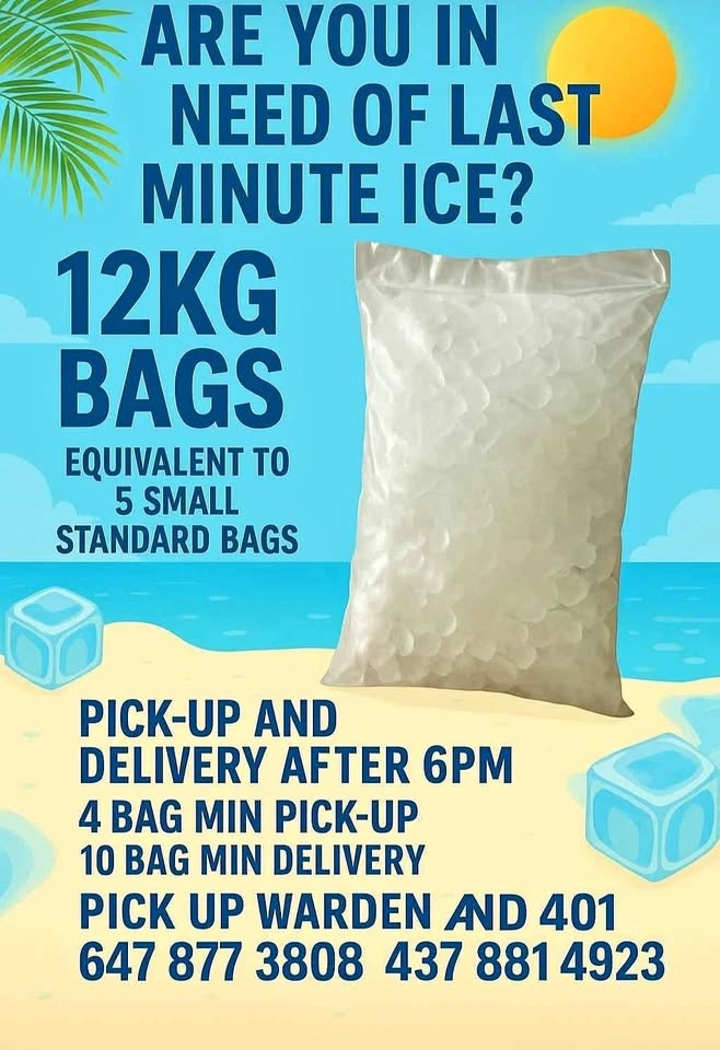 94Donโt stress โ we got you covered! Grab our fresh 12kg ice bags โ perfect for BBQs, parties, or last-minute ice emergencies! Pick Up: 4 Bags Minimum ๐ง 1 jumbo bag = 5 regular-sized bags โ more ice, less hassle. ๐ฆ Stock up fast and skip the store run! ๐ Pick-Up Available ( Warden ๐ฅ Also Available: Dry Ice โข 2x2 Cubed โข Ice Sculptures