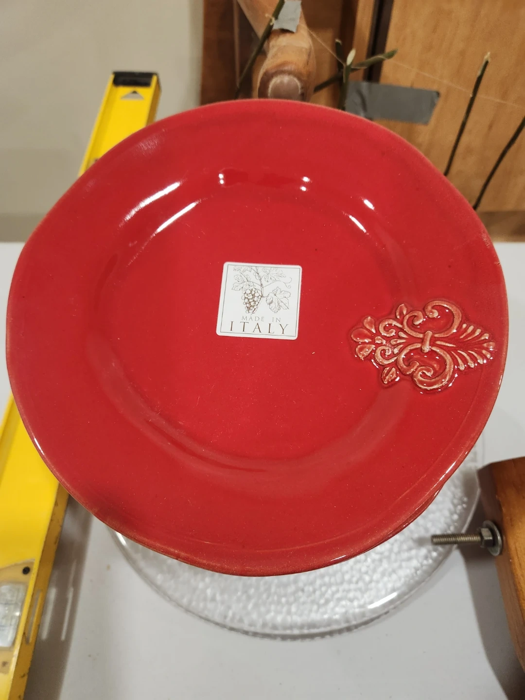 15Selling a lovely red plate, marked 'Made in Italy'. It features a beautiful design and is in great condition. Perfect for adding a touch of Italian charm to your table!