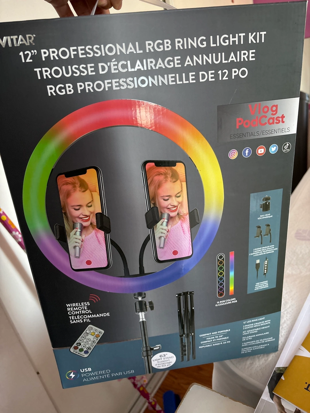 31This is a 12-inch professional RGB ring light kit that comes with a wireless remote control, two phone cradles, a 63-inch adjustable light stand and a USB charging cable.