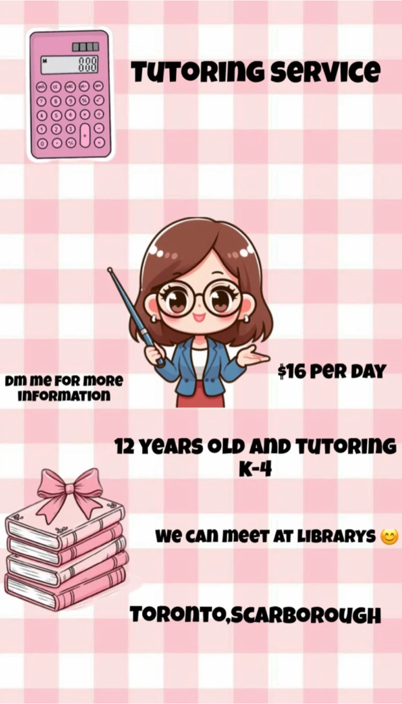 I’m 12 years old I tutor kids k-4 I bring worksheets and I’m always looking to help improve things there stuck on.Its $17 per day I can do 1 hour or 2 hours I’m flexible😊.I can meet at library’s.Dm me for more information please.