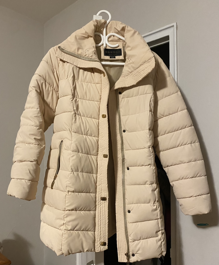 Winter jacket. Puffy & warm. Draws in at the waste when zippered. Semi petite size but labeled medium. No wear so original warmth. Comes with attachment / fake fur collar for added warmth. Pale pink.