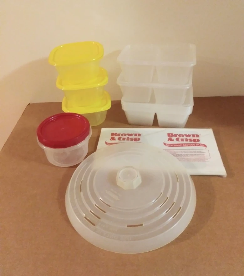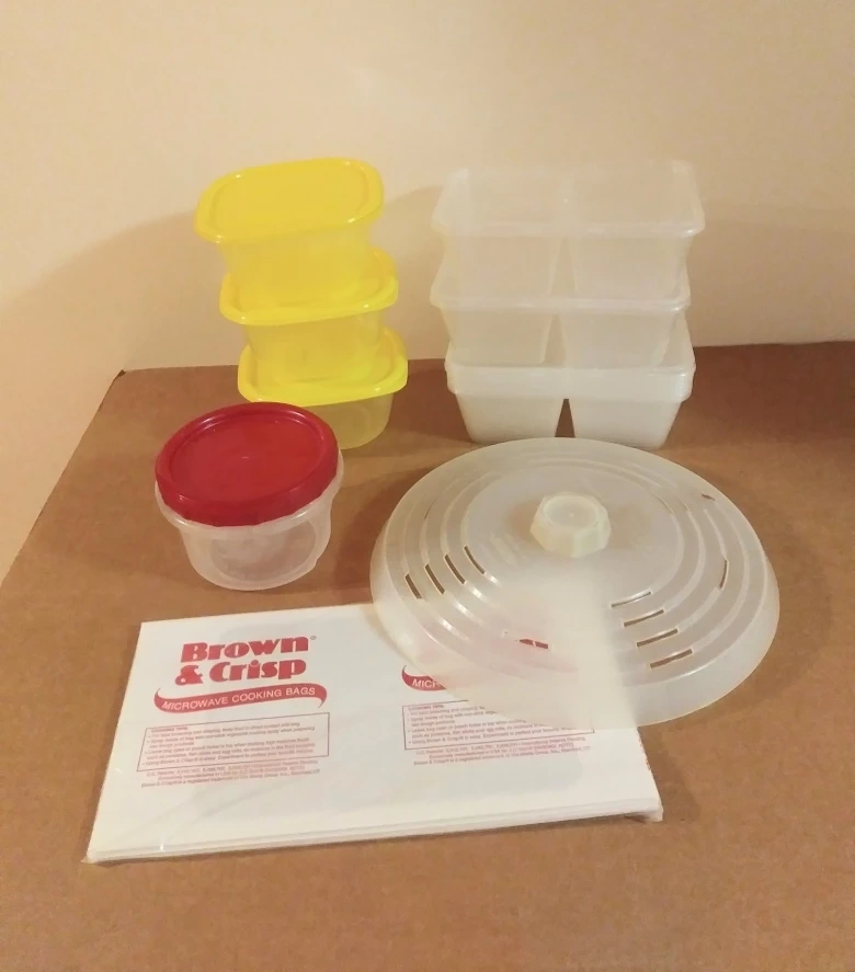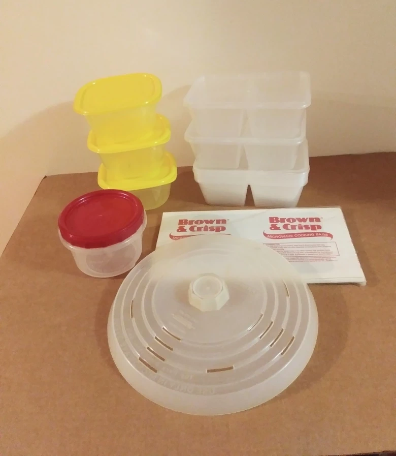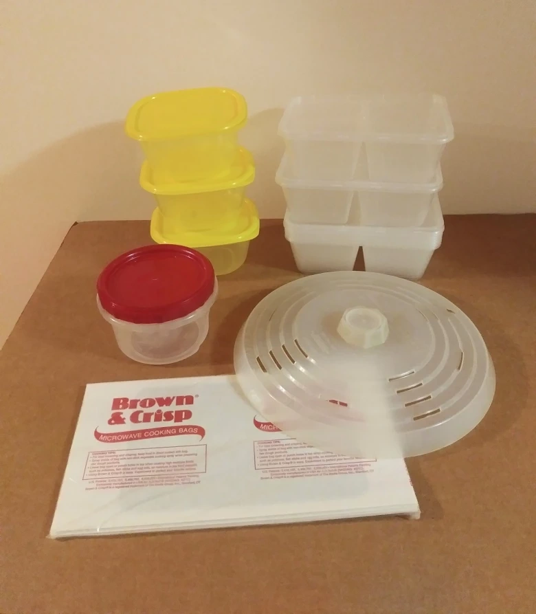 A 15-piece set of new and lightly used items for the microwave. Items include a splatter guard cover, a small Ziploc container with a red lid, 3 small tubs with yellow lids, 9 clear divided containers with lids, and a pack of 12 new and unused Brown & Crisp microwave cooking bags.