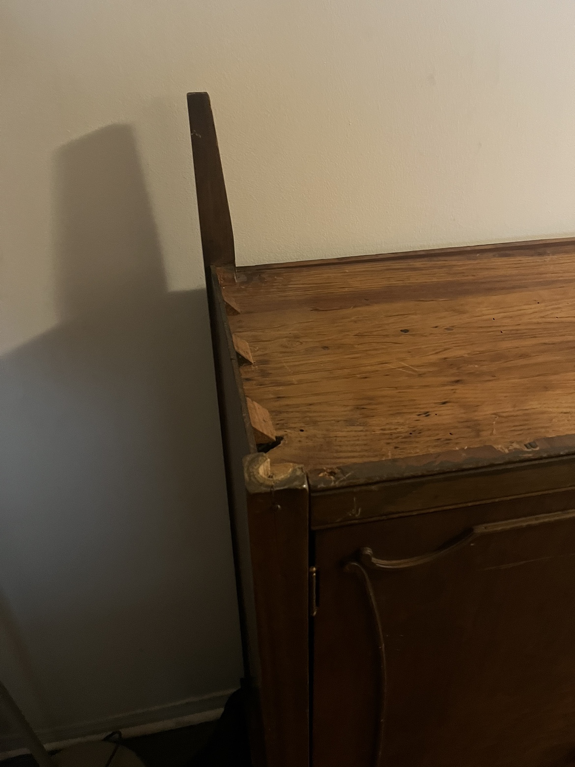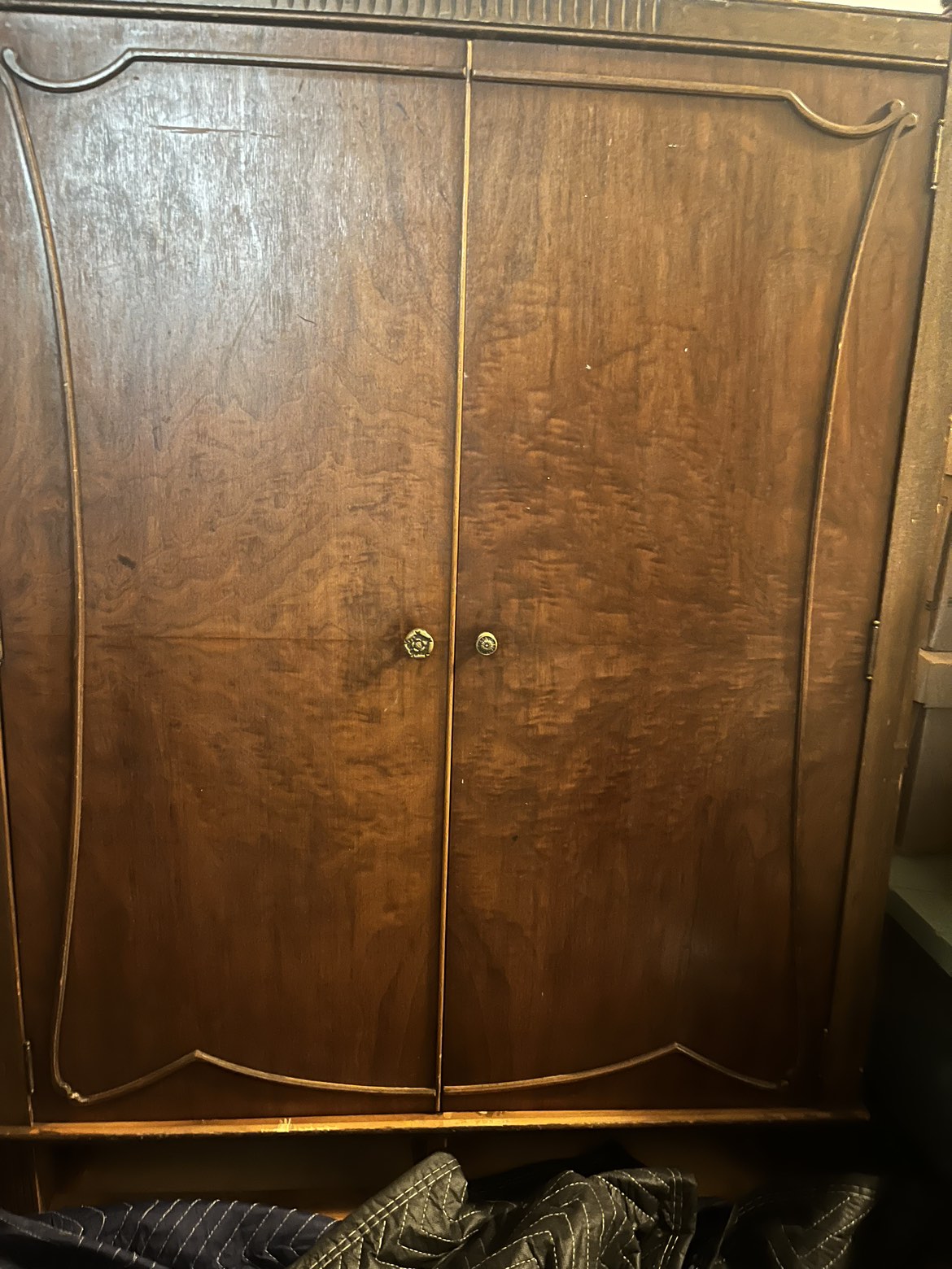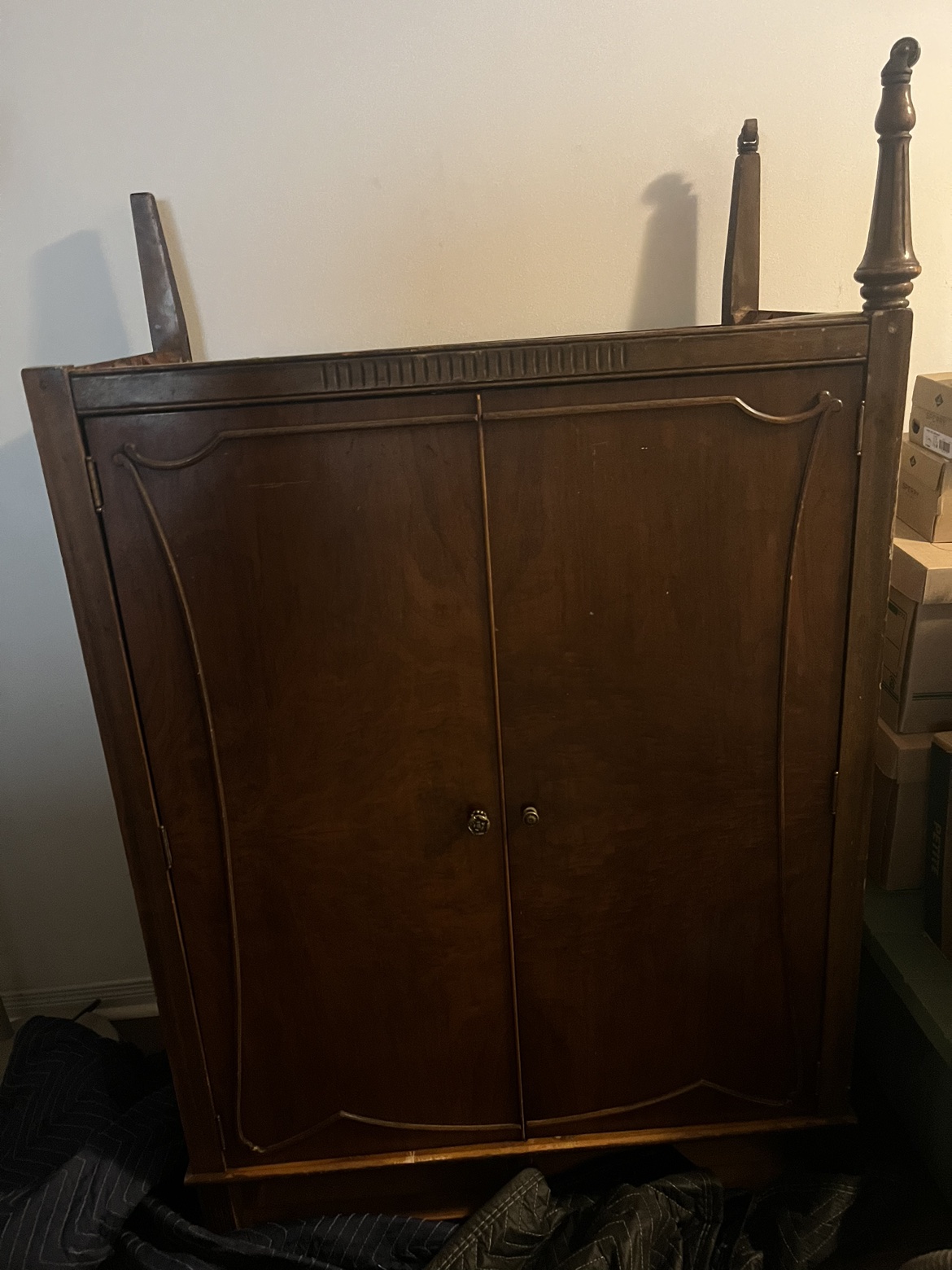 160Bought this as a project to fix up back to its glory but it is too large for me to move around to actually fix. One leg is broken which is why it’s upside down. Can easily be glued and repaired when refinishing. Also comes with drawers for the interior. Wish I could do it myself but don’t have the space I thought I did. First come first serve. Bring help to move.