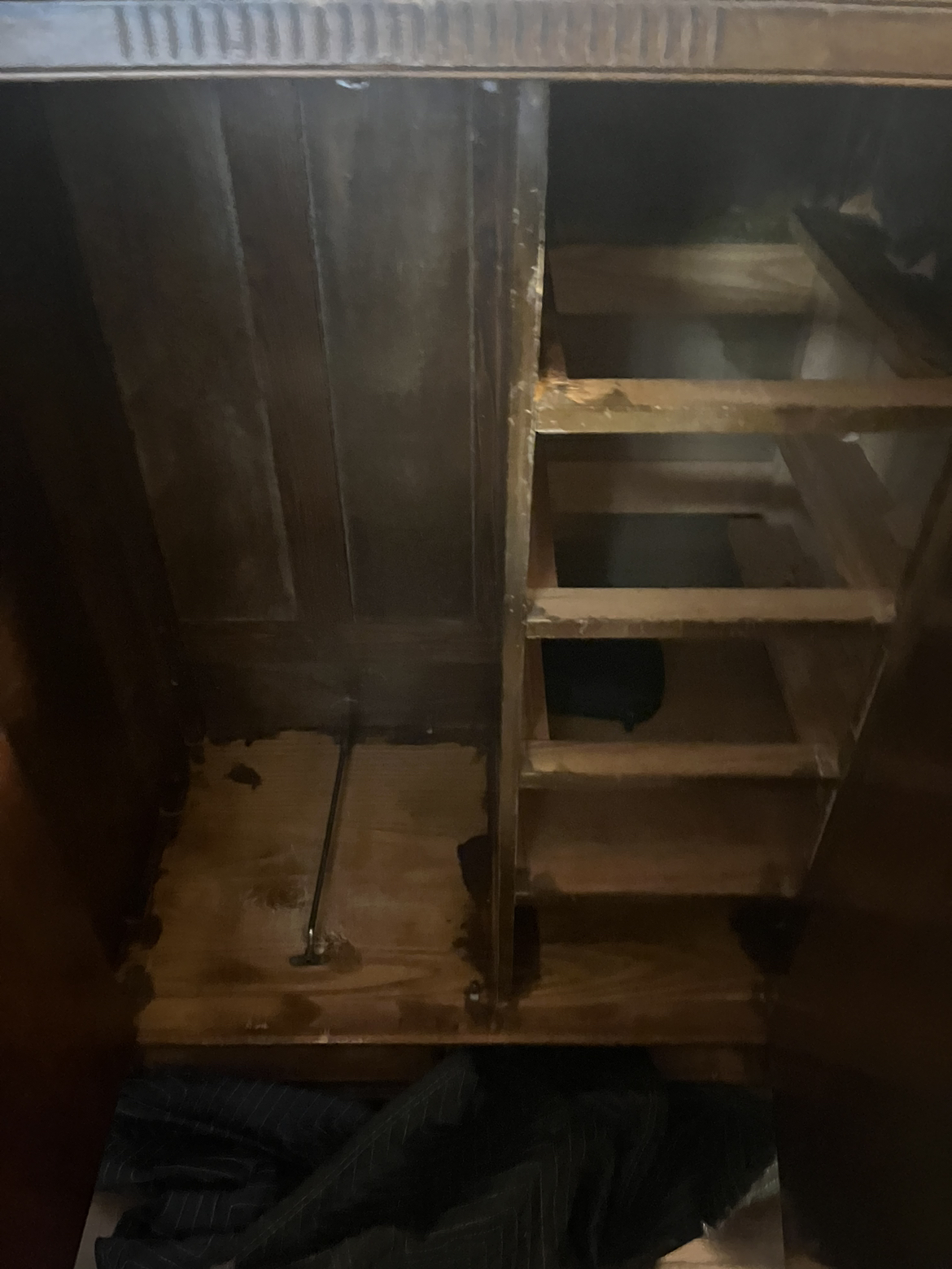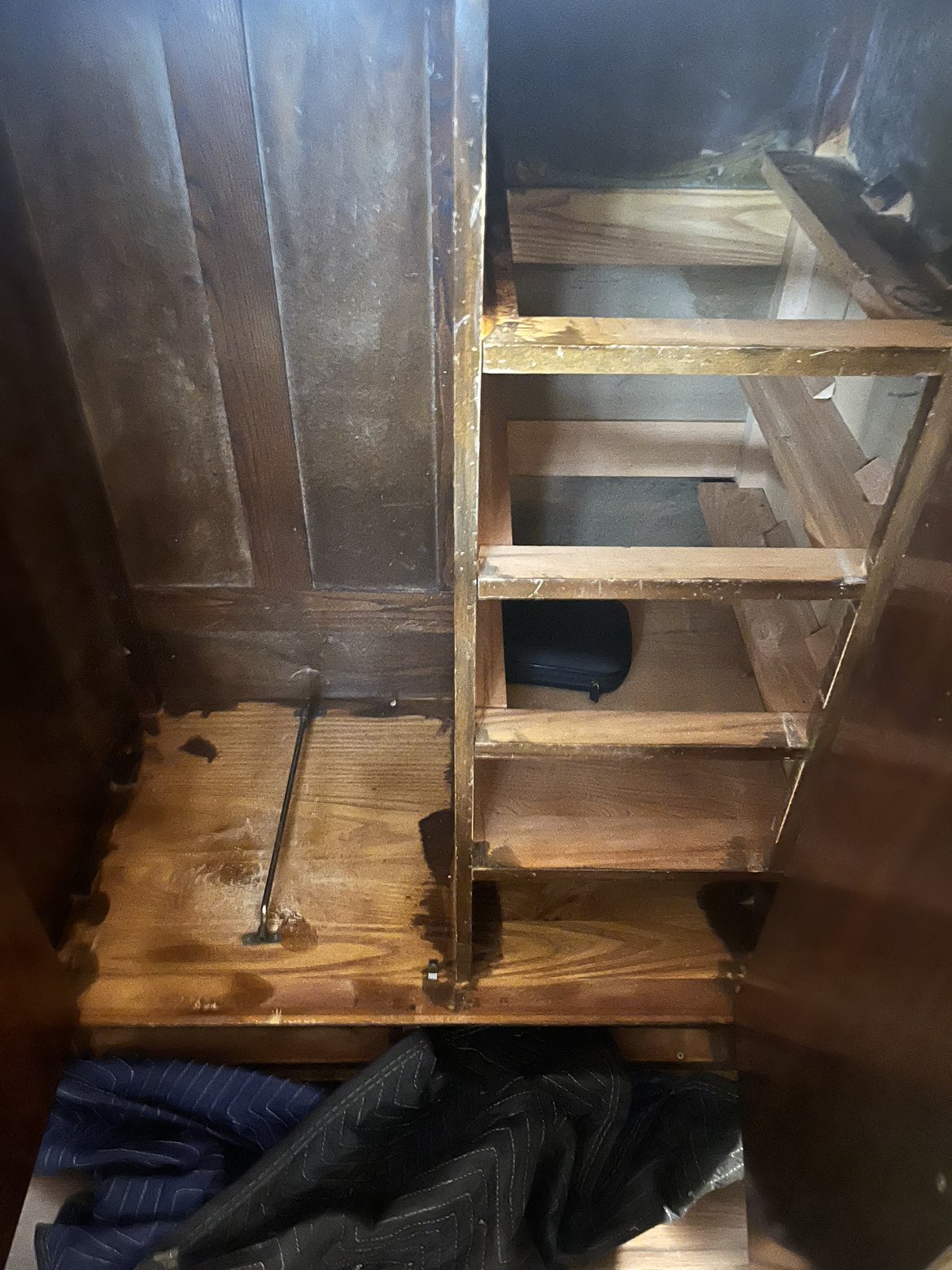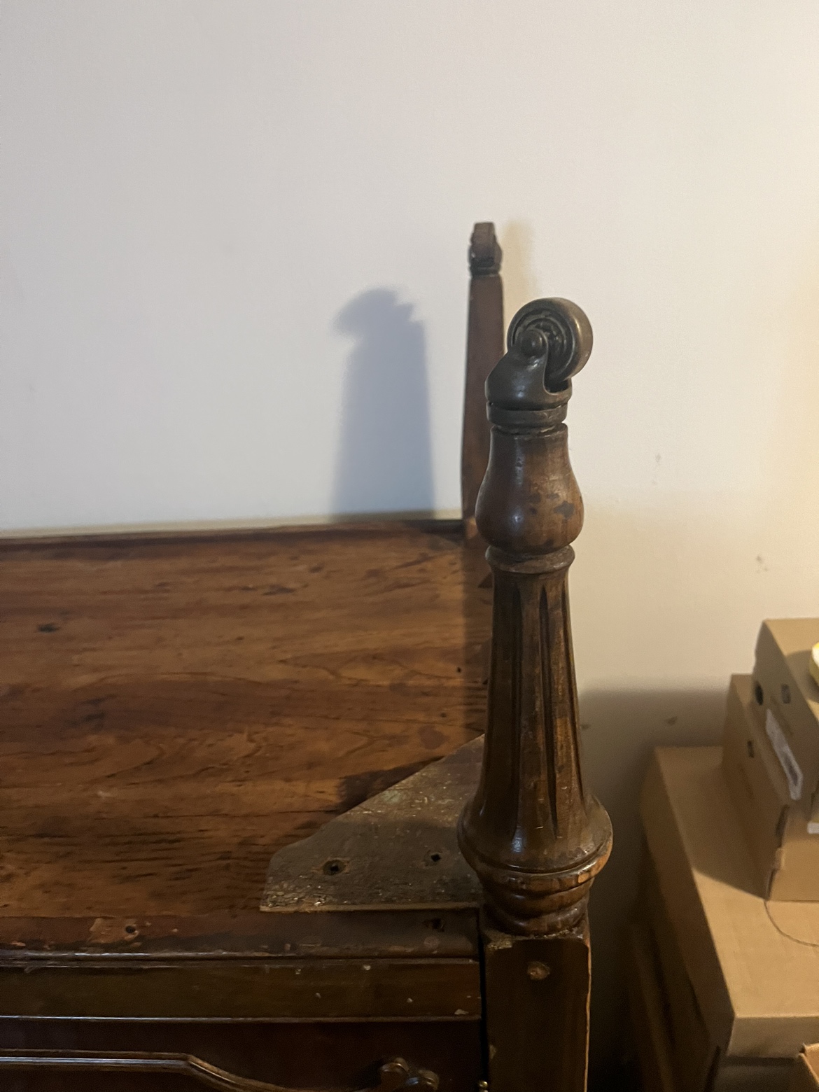 160Bought this as a project to fix up back to its glory but it is too large for me to move around to actually fix. One leg is broken which is why it’s upside down. Can easily be glued and repaired when refinishing. Also comes with drawers for the interior. Wish I could do it myself but don’t have the space I thought I did. First come first serve. Bring help to move.