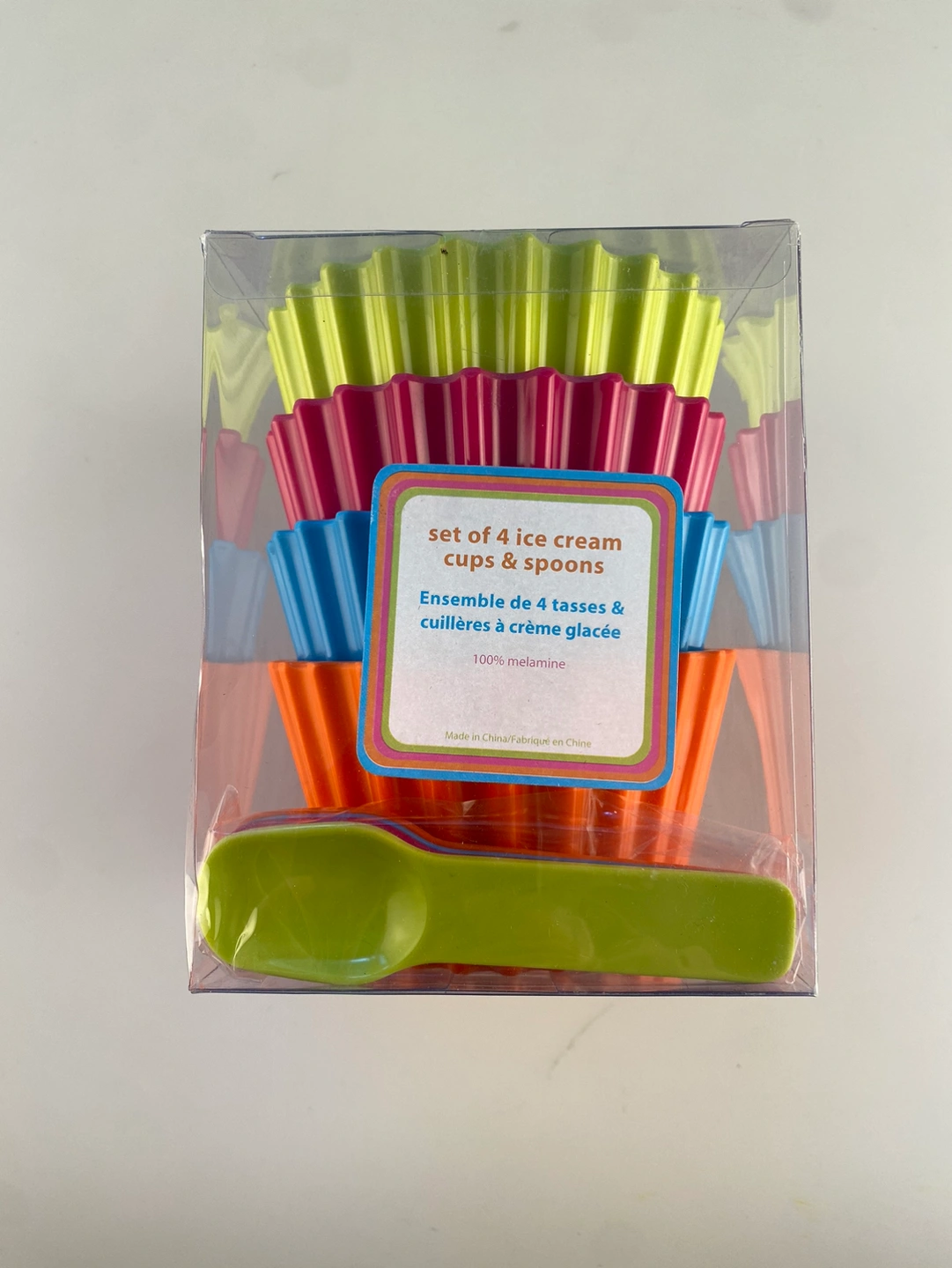 New set of four colourful ice cream bowls with matching spoons. The ice cream cups & spoons come in green, hot pink, blue and orange. Made of melamine. Comes in a clear box. Ready for pickup.