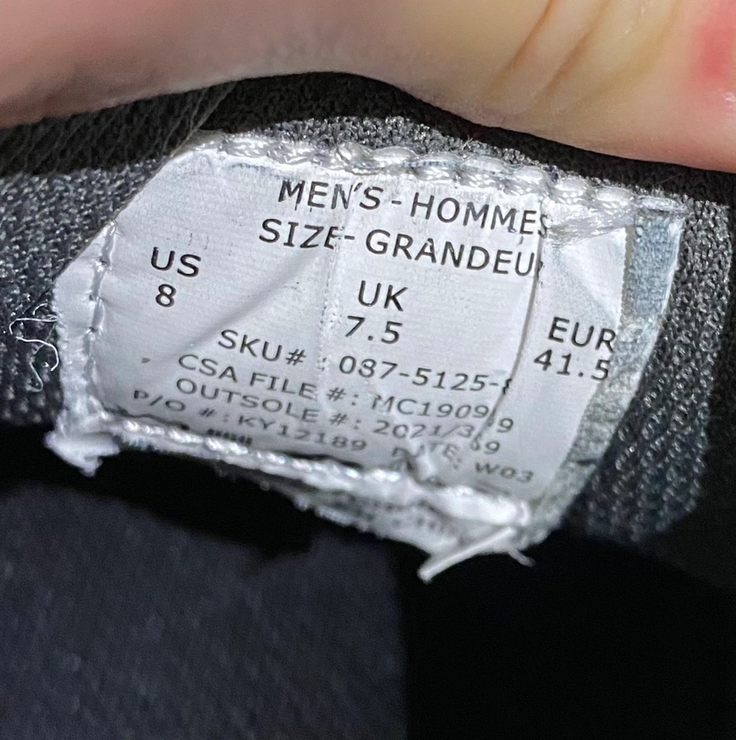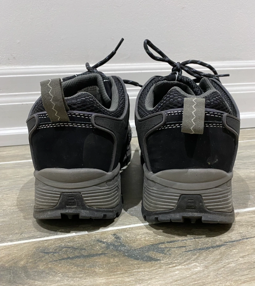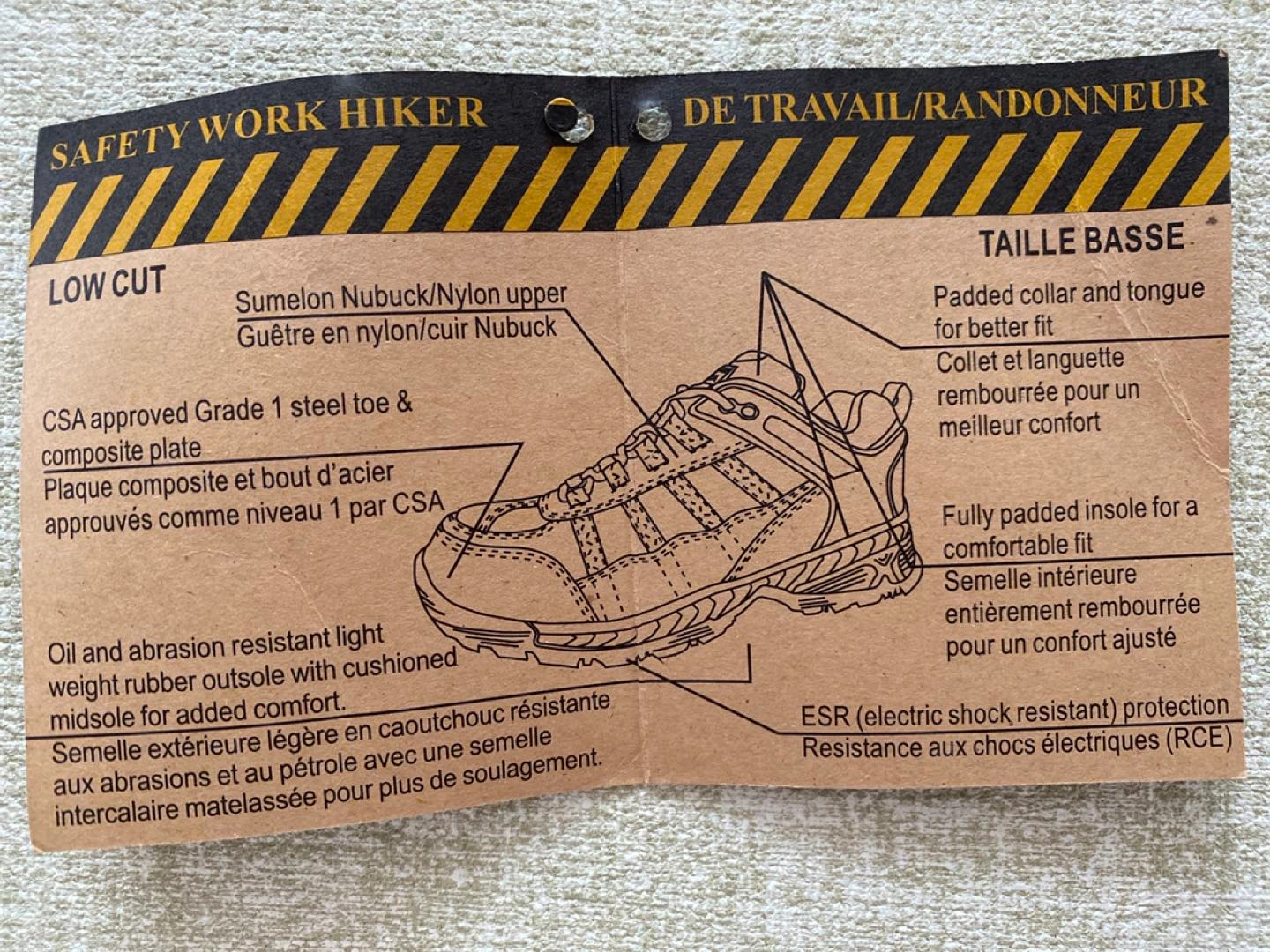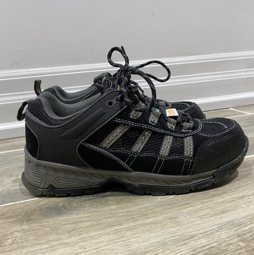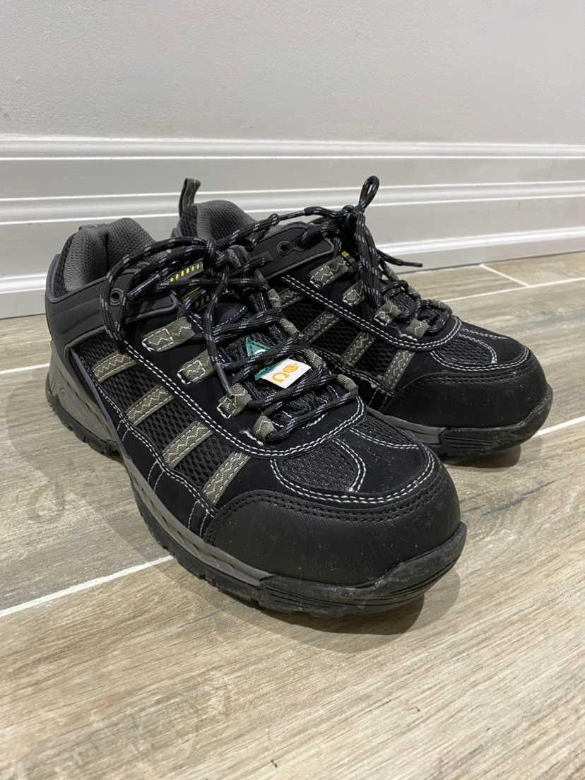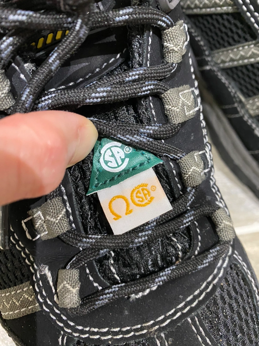 Safety worker low cut shoes, CSA approved green triangle logo, insole steel toe, slip-resistant soles.