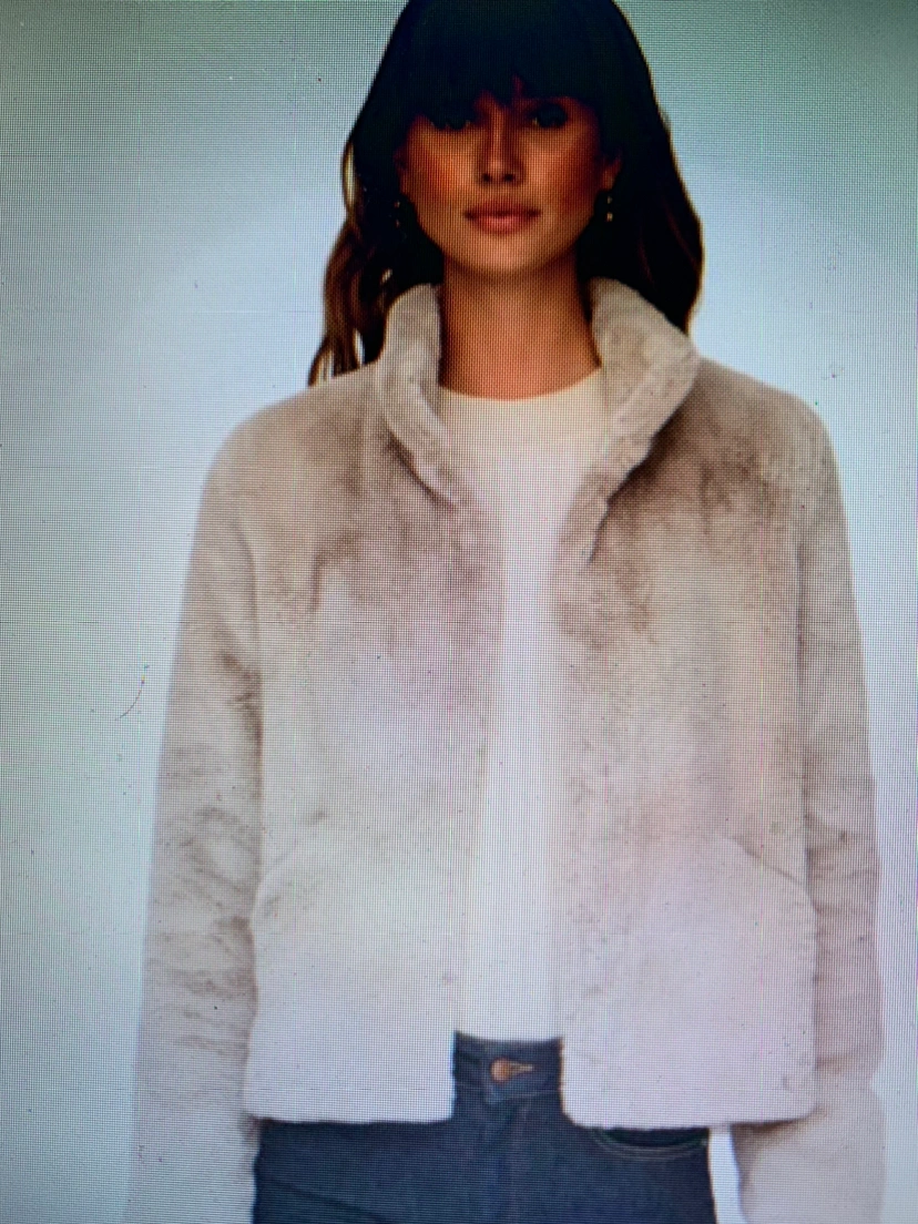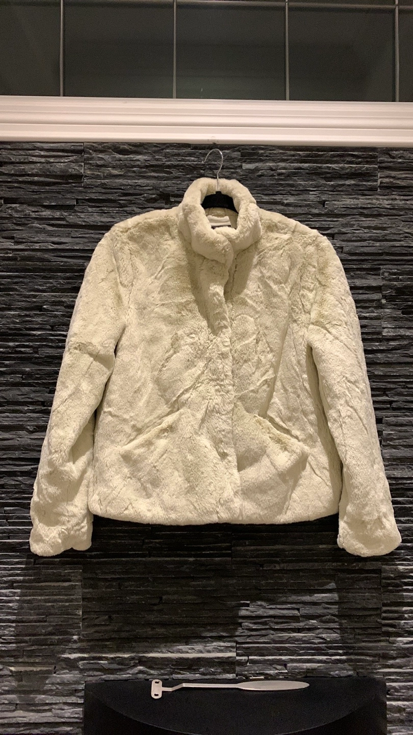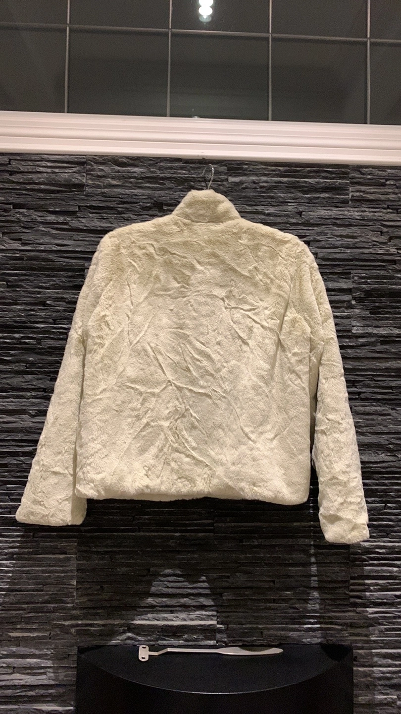 Super soft faux fur short jacket. High neck, snap closure, two side pockets, fully lined. White/humus color. Brand new without tags.