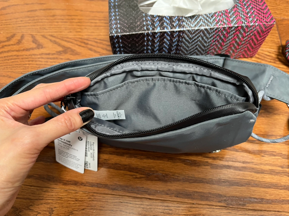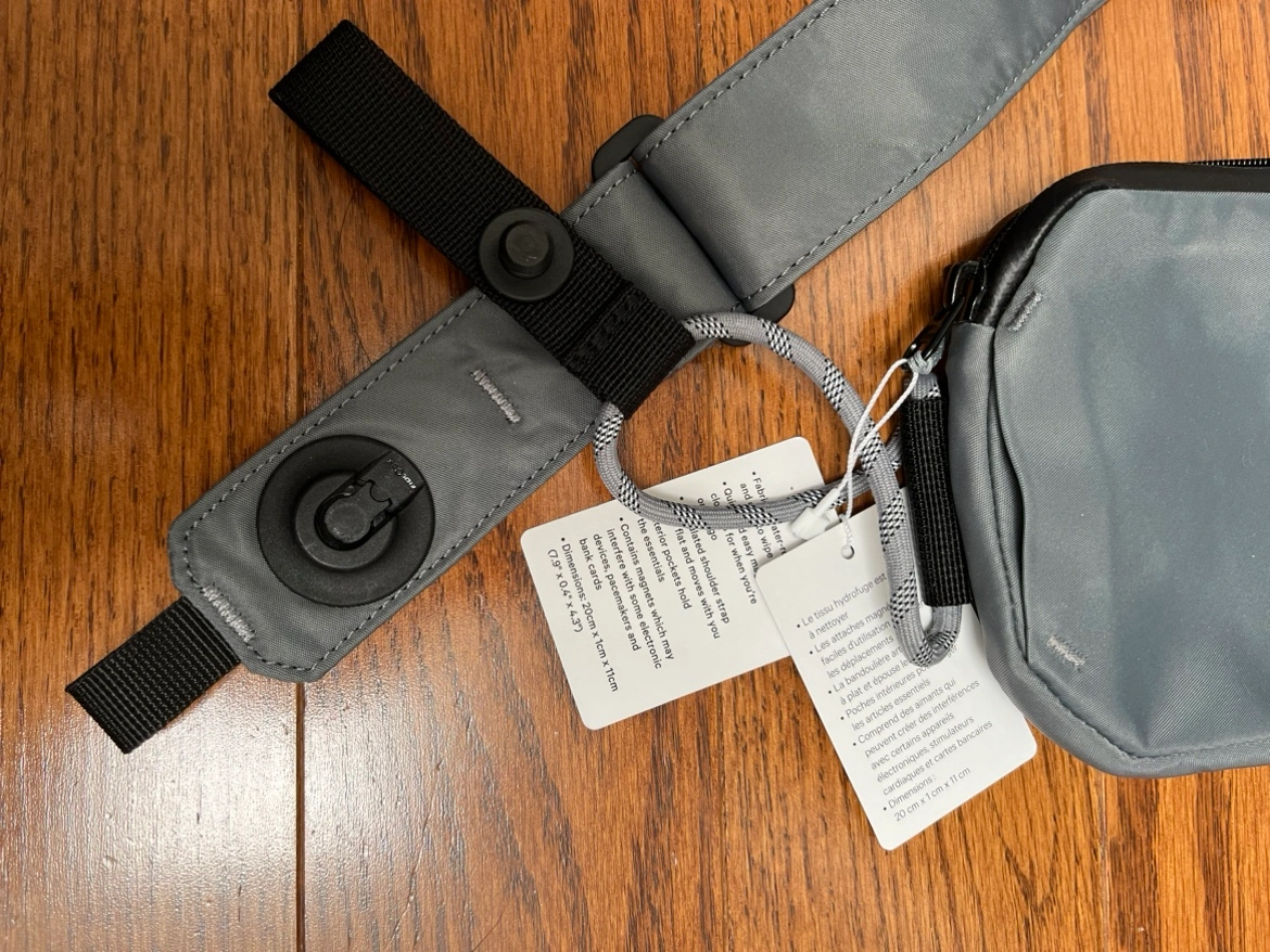 Unisex Grey Pop it off crossbody bag. Snap button allows taking off without the fuss of fighting through coats and shoulders. Adjustable strap. Bag Size is about same as everywhere belt bag. $45