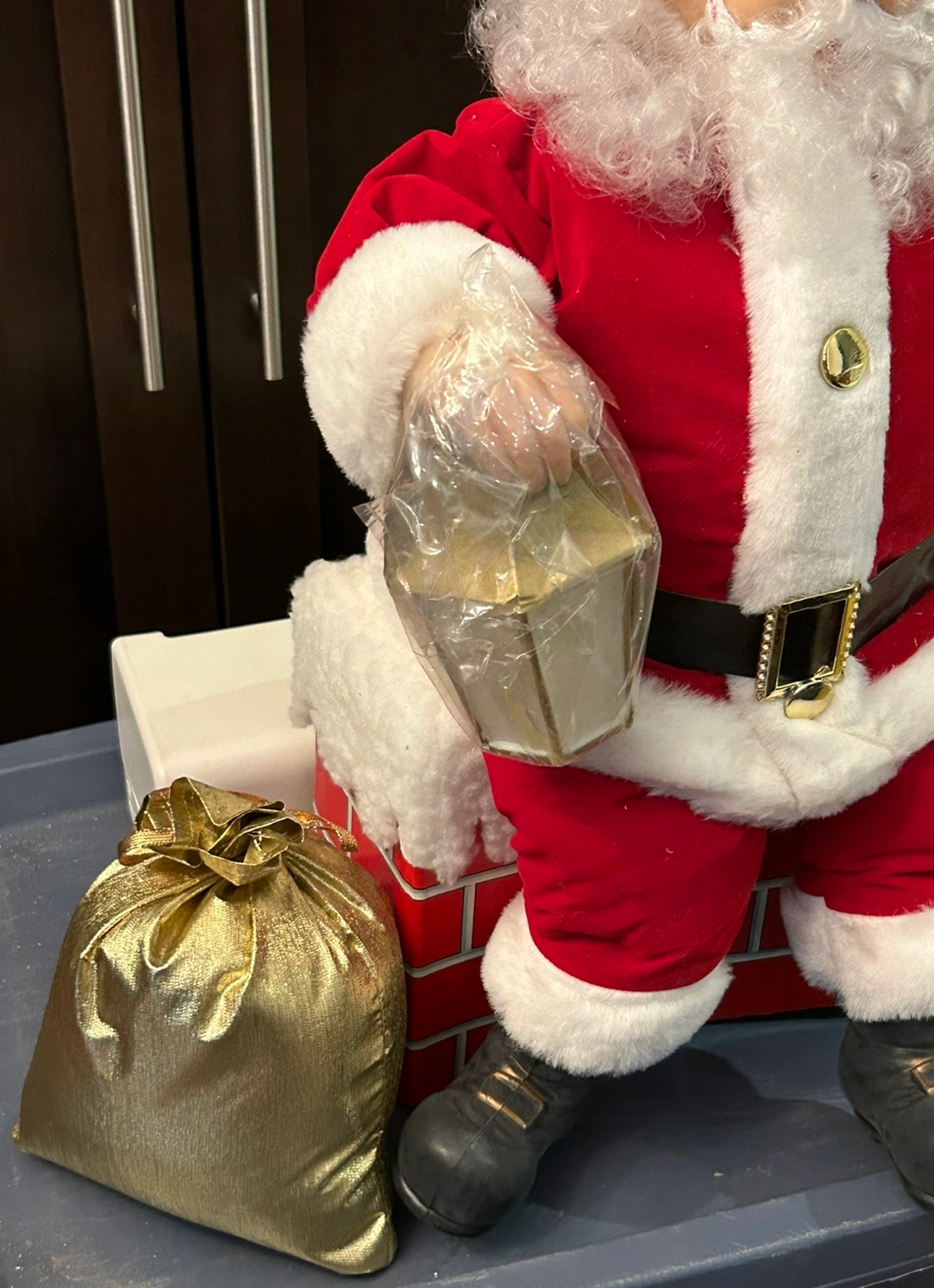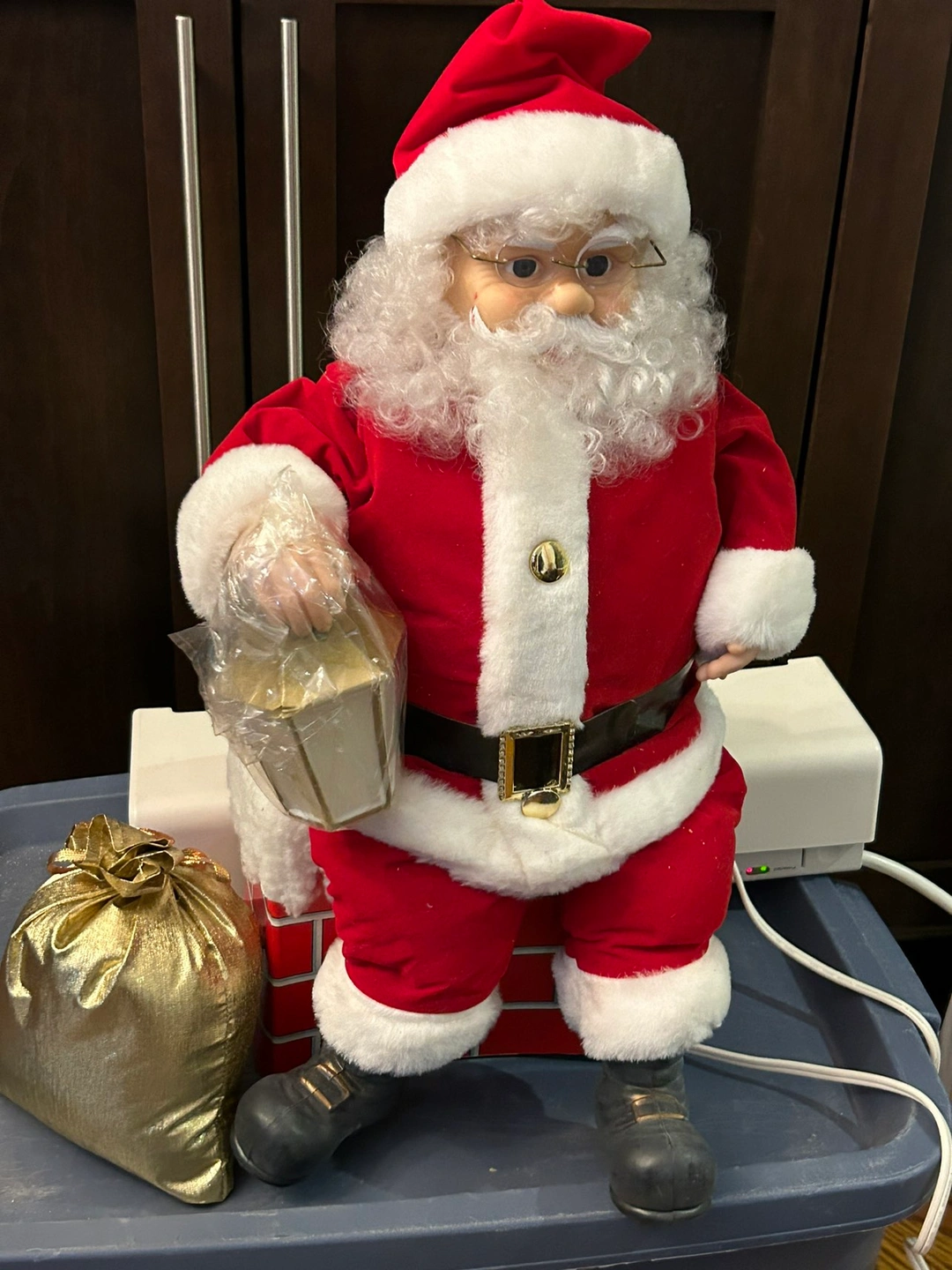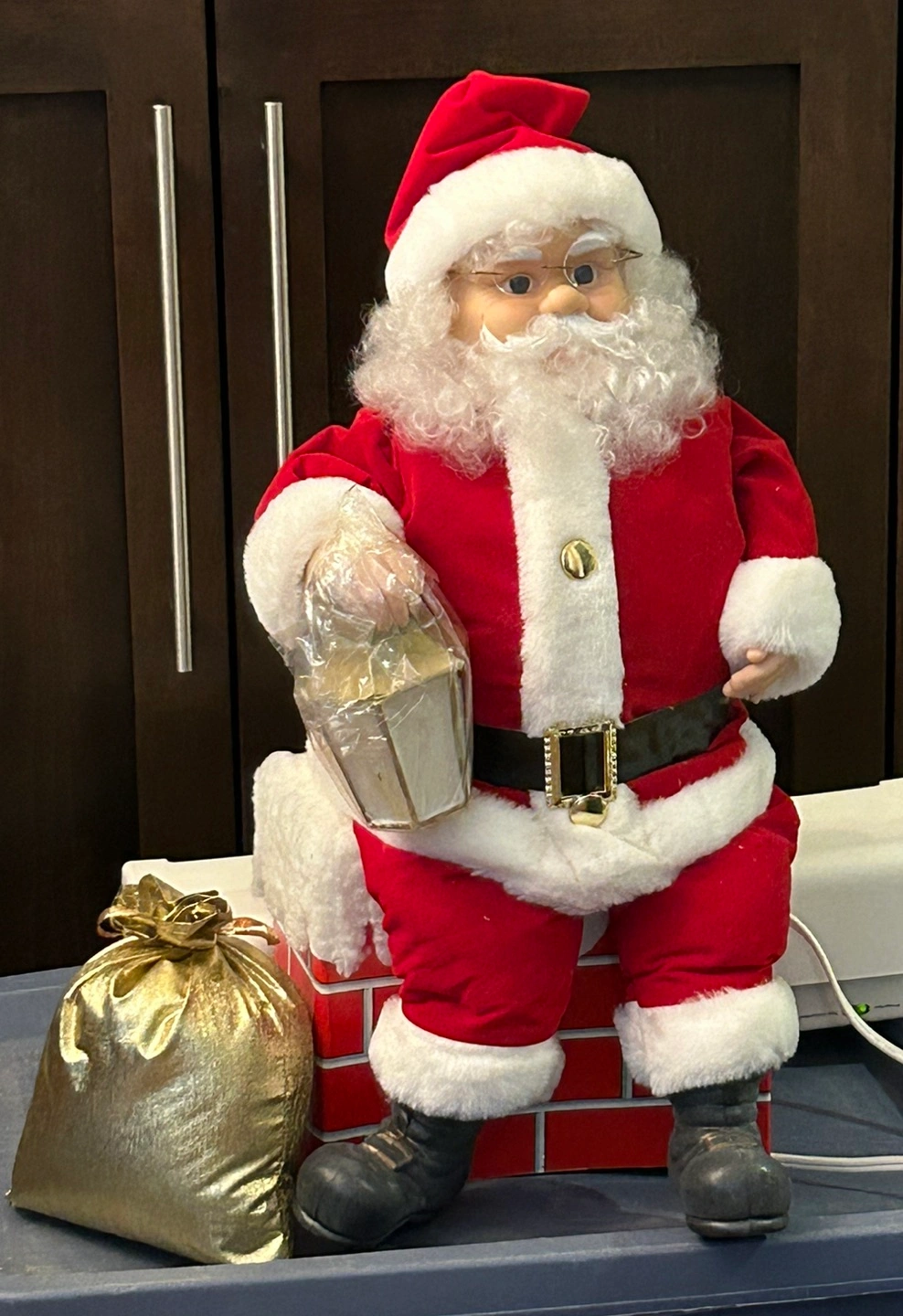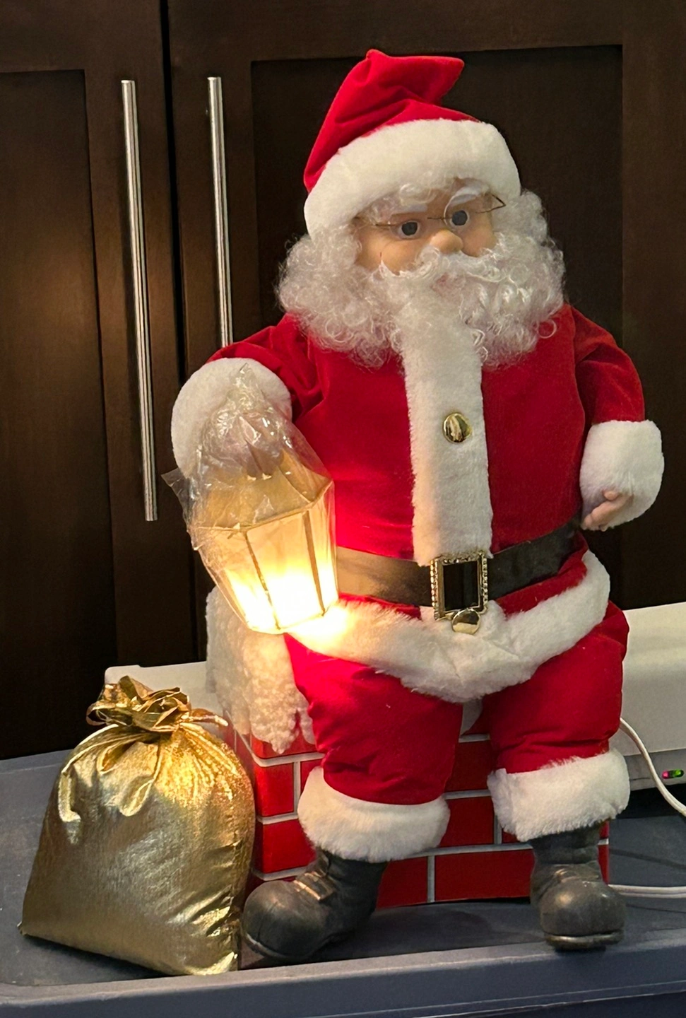 Santa Claus on Chimney. Vintage piece, very rare, you won’t find this in stores. Brand new without tags. Lights up and moves. Gold pouch included. Light is still wrapped in plastic.