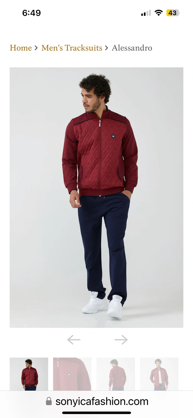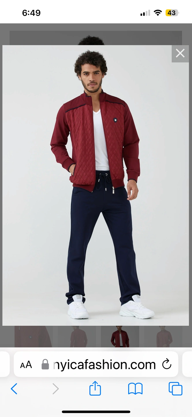 Brand new,, men’s dark red and navy two piece tracksuit. Impressive diamond cut quilted jacket with full front zipper and side pockets, trimmed with contrasting navy piping. Navy piping perfect for the fall and spring weather. For a casual look, the wear the pants or carry this jacket with your favourite jeans or cords.