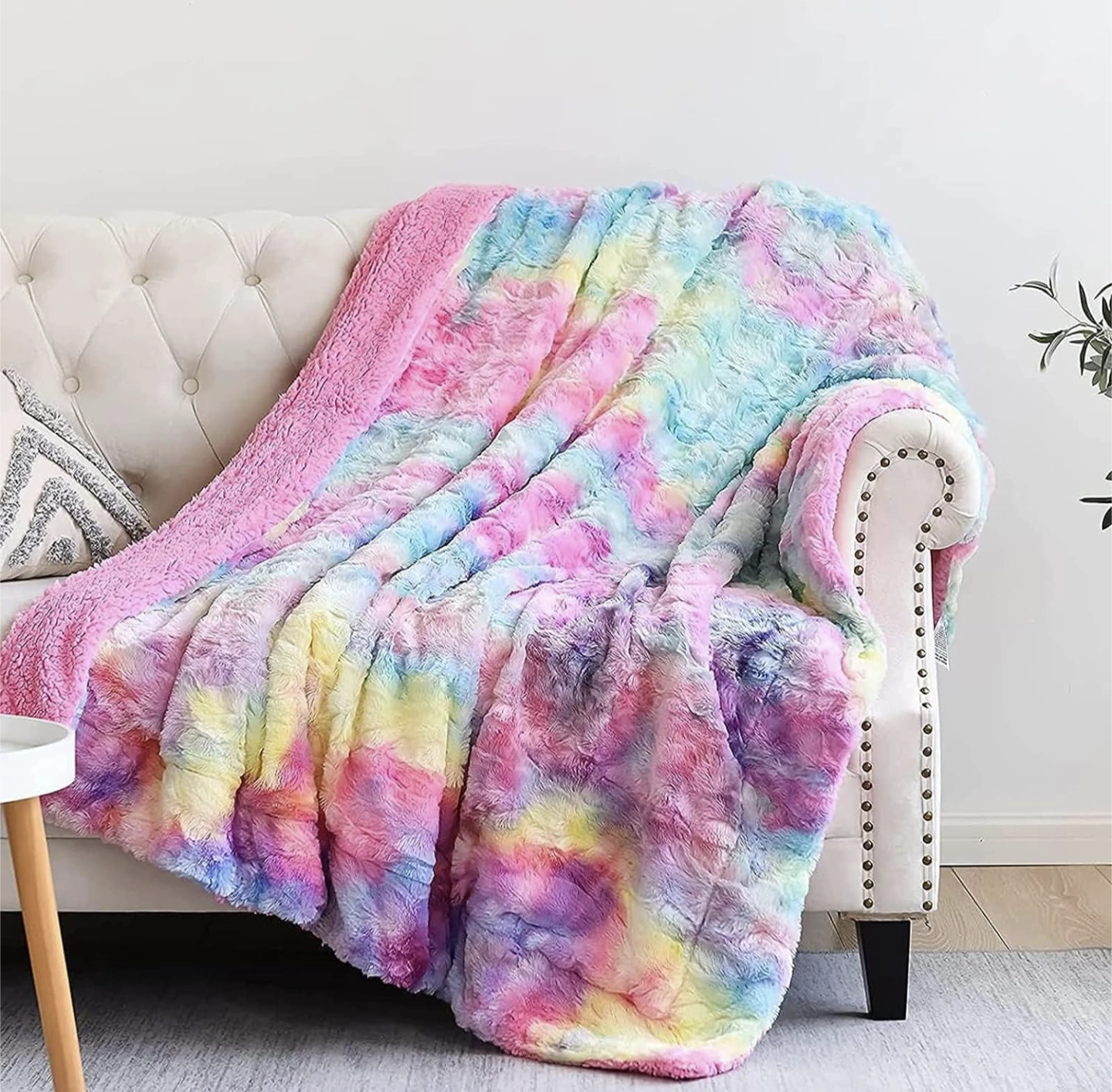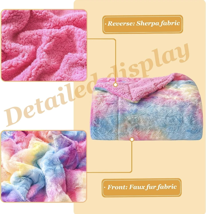 Plush faux fur side is all the colors of the rainbow, vibrant, soft, luxurious, warm.