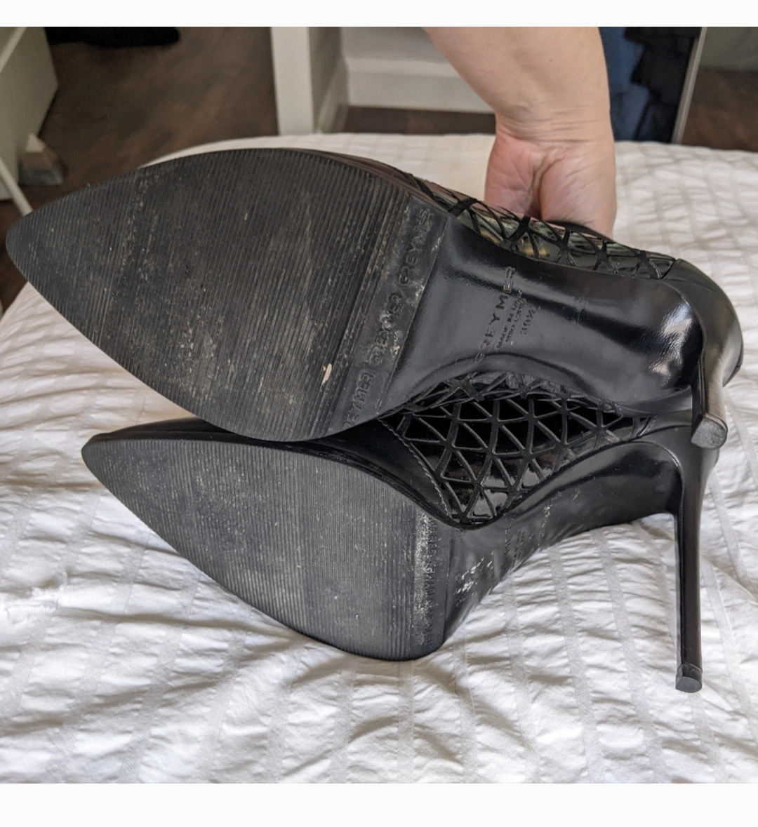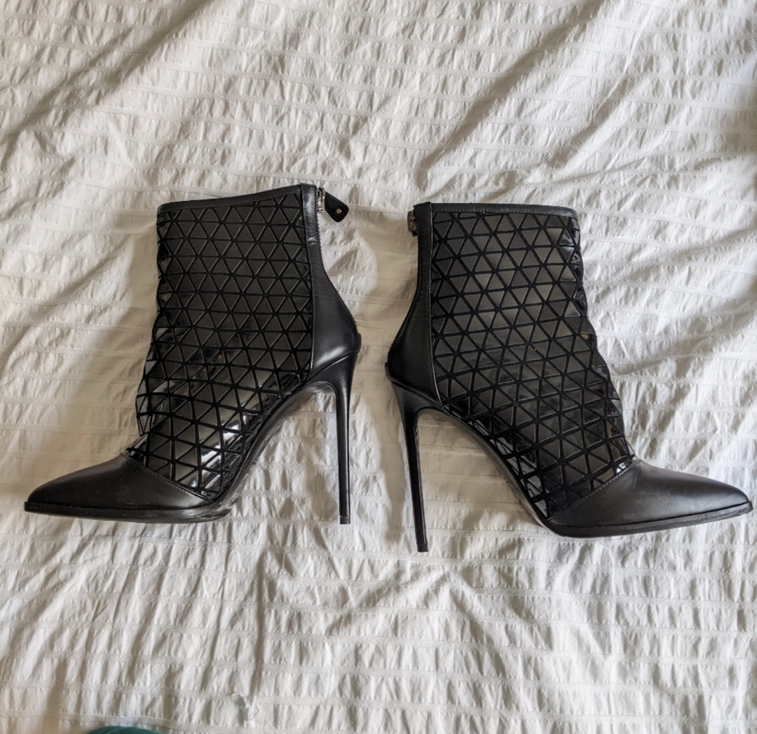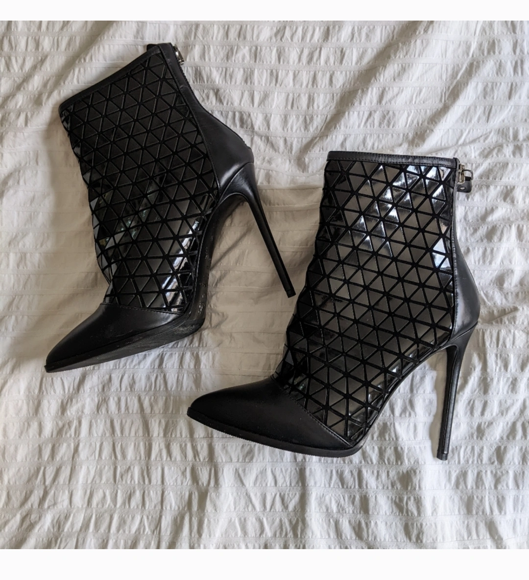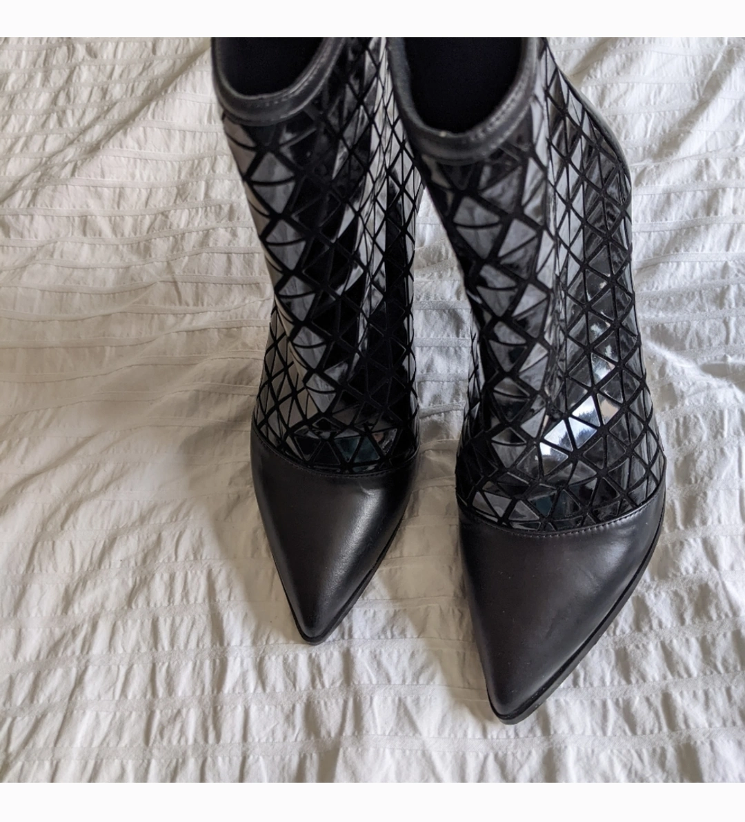 gorgeous high heeled boots made on Italy. black with pointed toe, lovely tiling/disco ball detail with zippered backs. worn only twice. size 39.5, about an 8-8.5