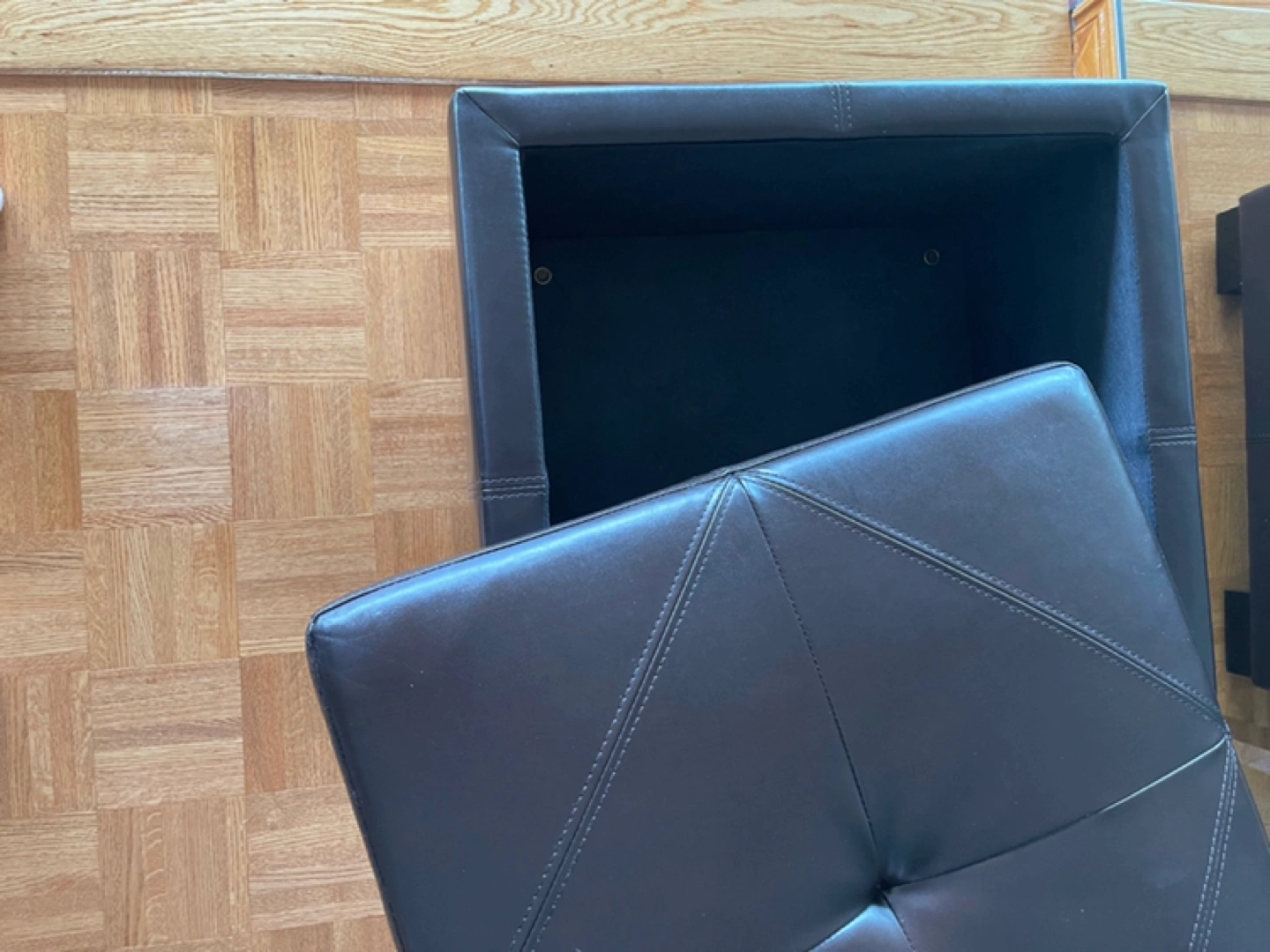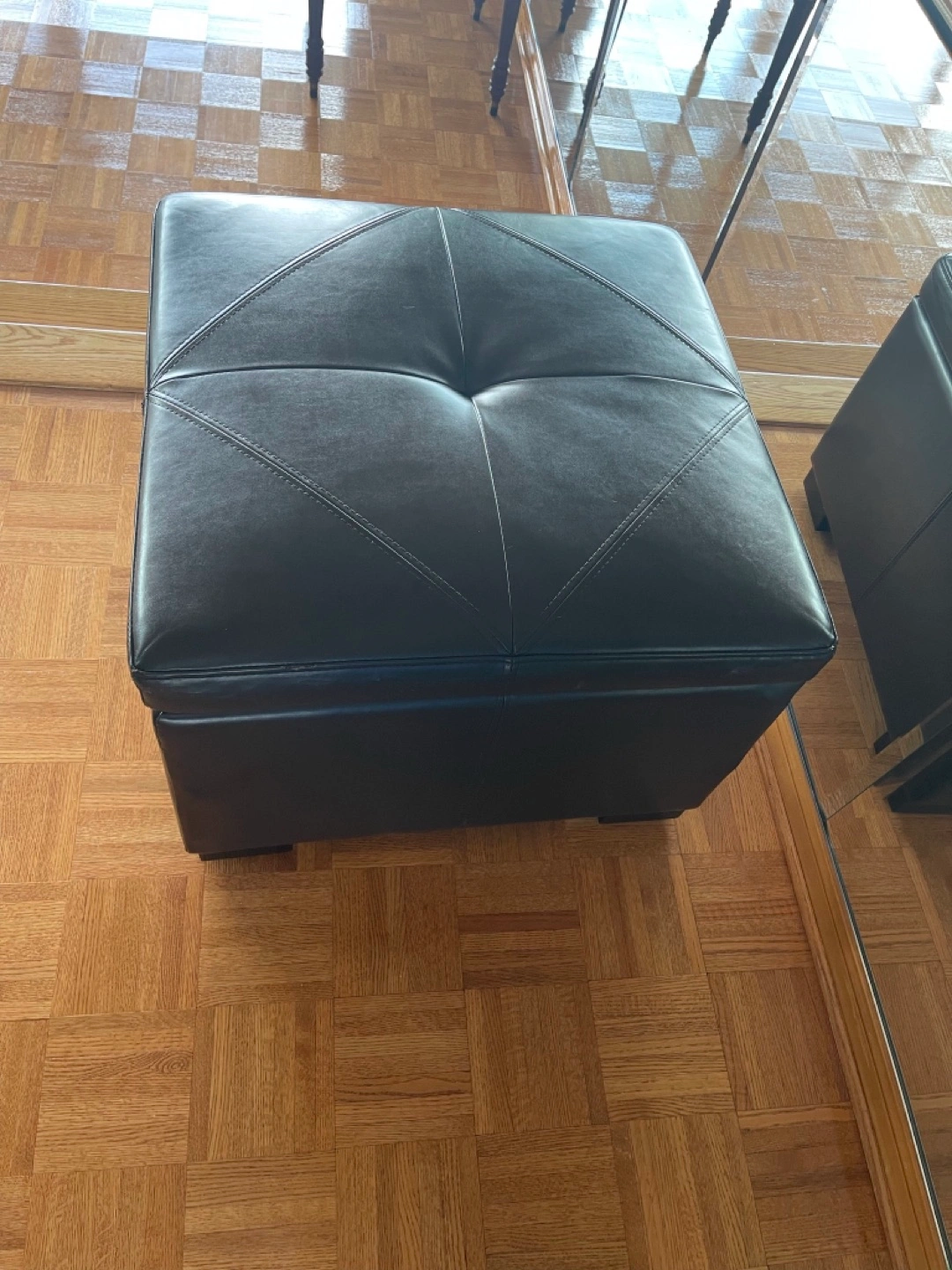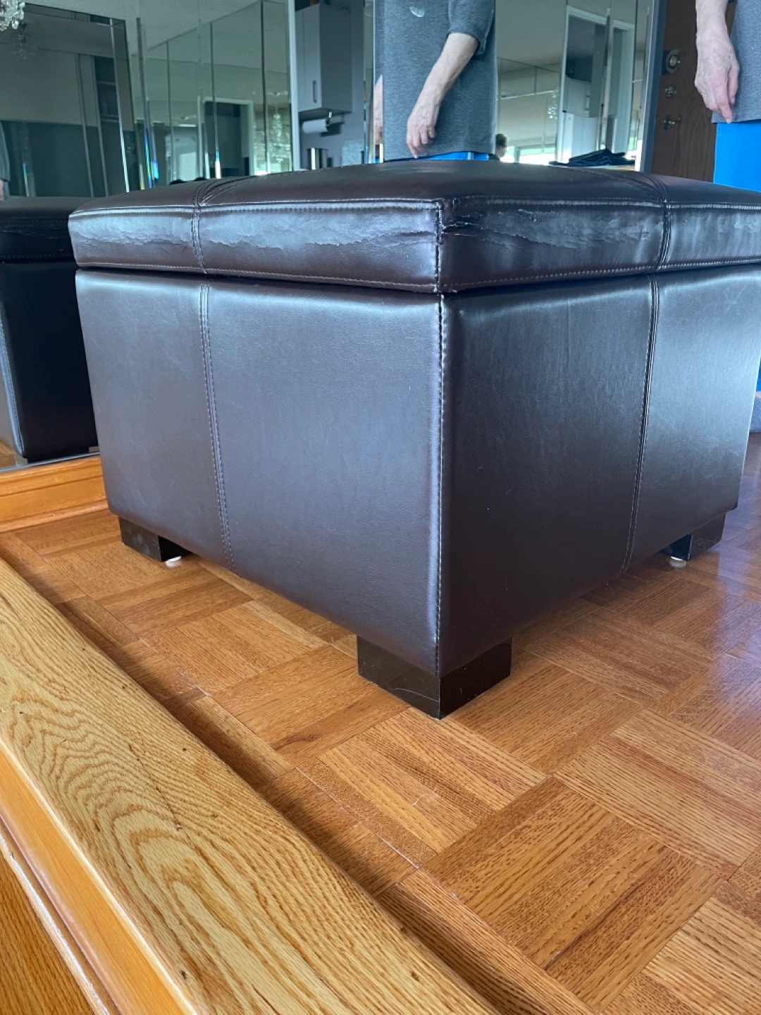 Ottoman is in good condition and clean. Sides of lid have signs of wear consistent with sitting on the ottoman. From a pet free and smoke free home.
