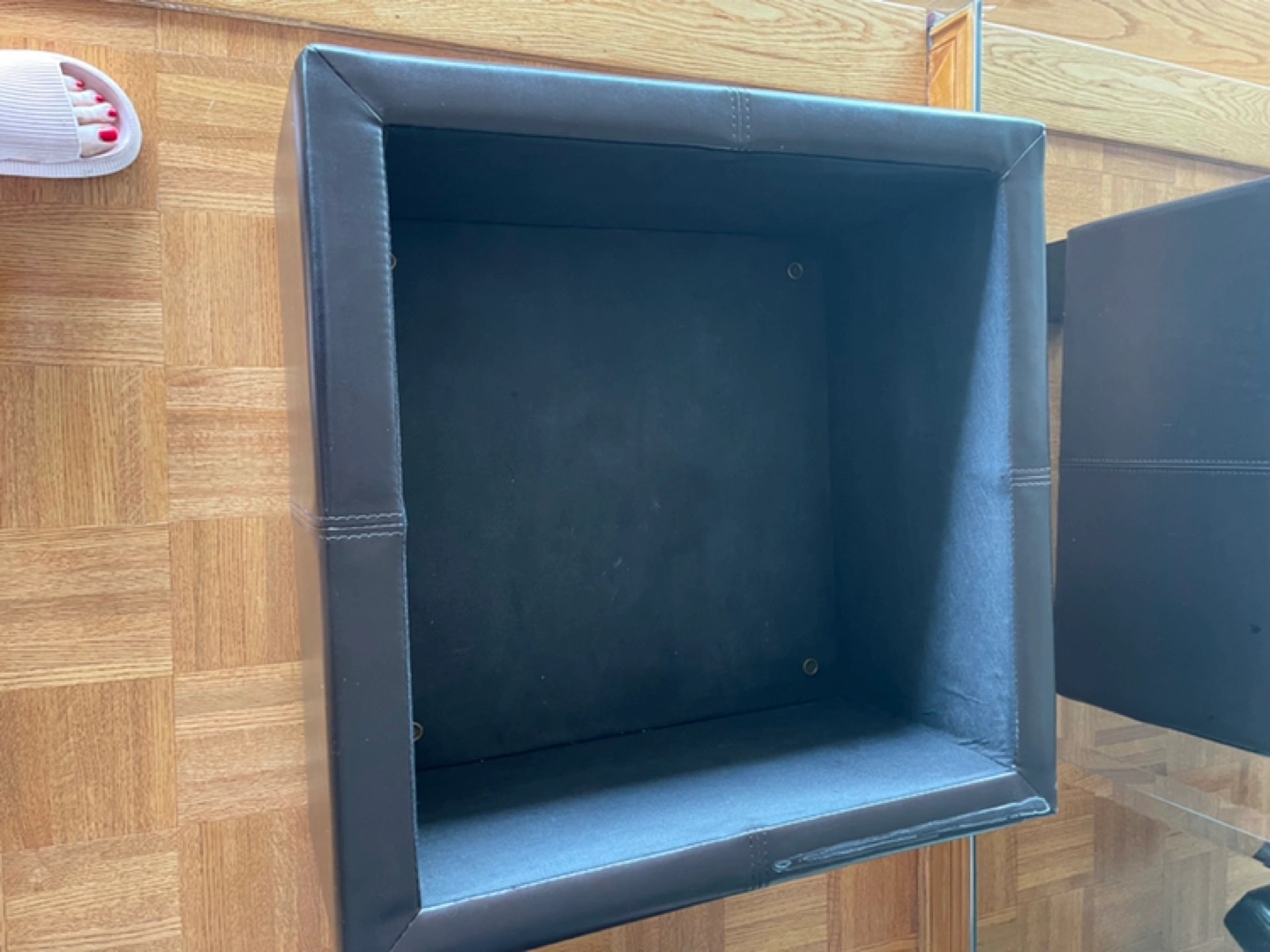 Large square ottoman with removable lid and large lined storage area.