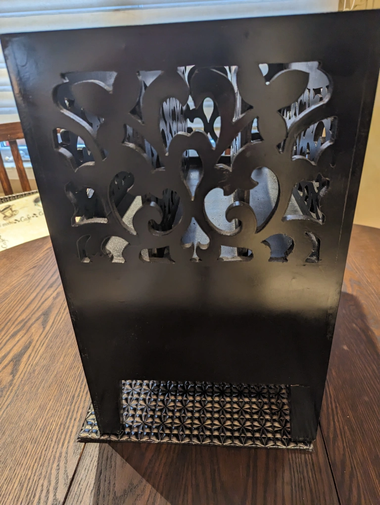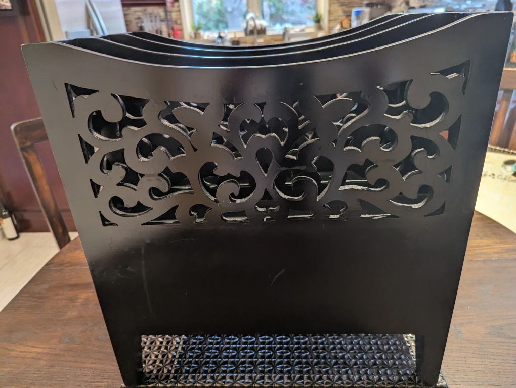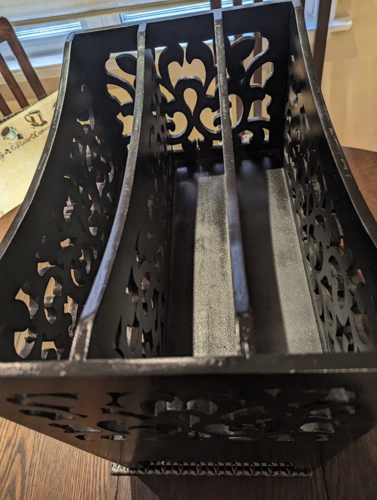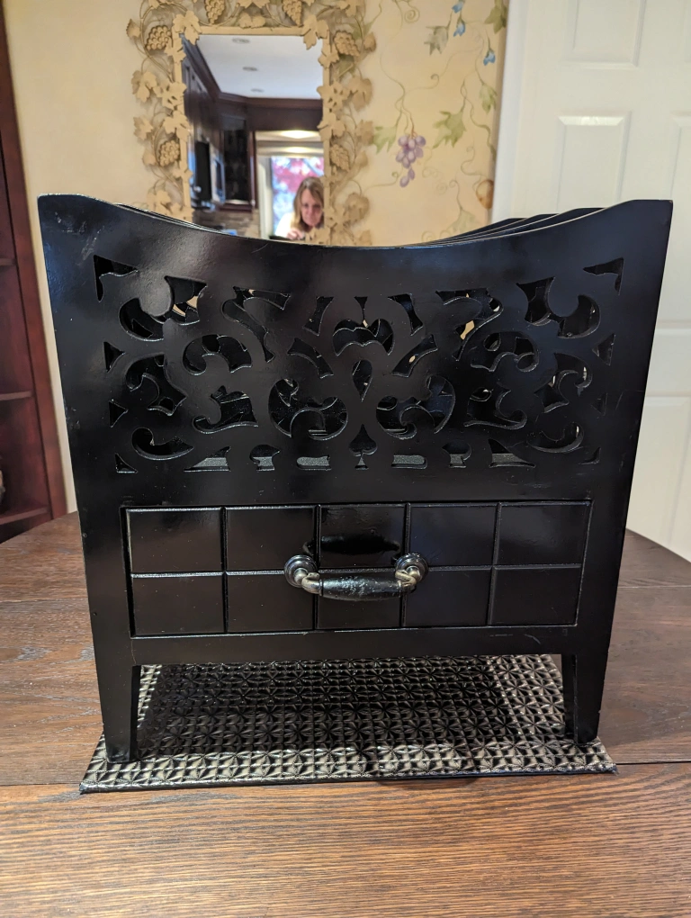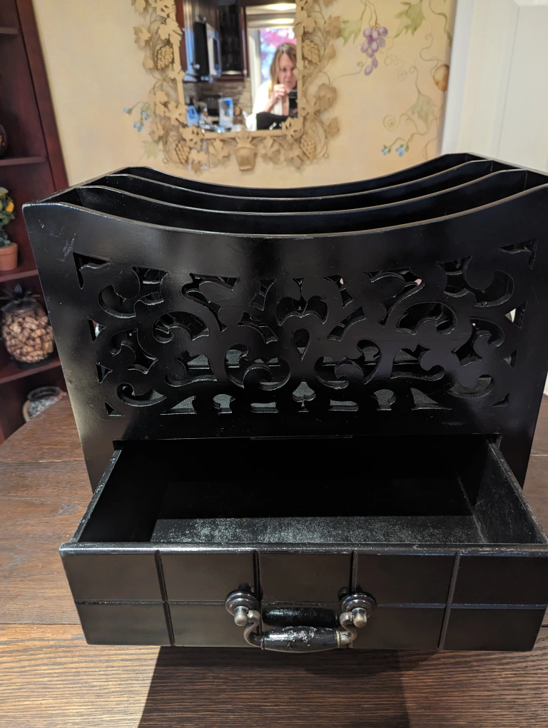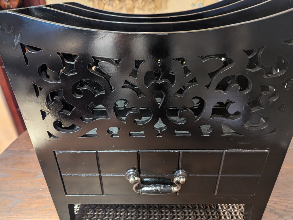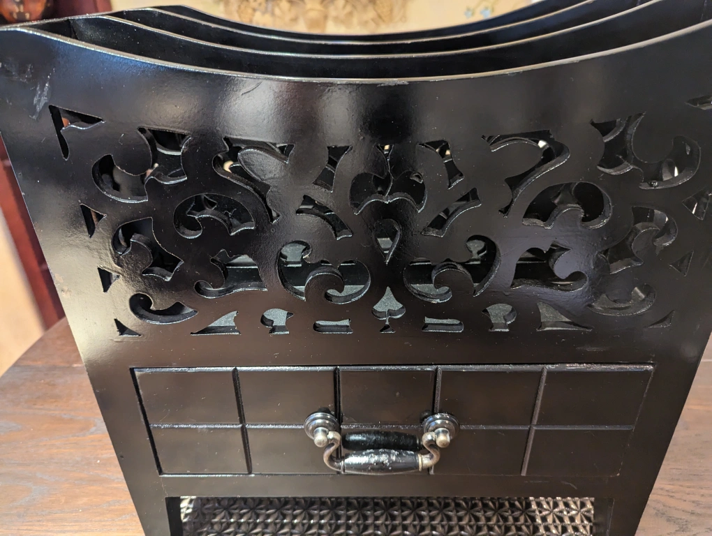 This item is solid and heavy. Made of wood with a black lacquer finish. There are intricate carve outs all around. There is a good-sized drawer beneath the 3 magazine sections.
