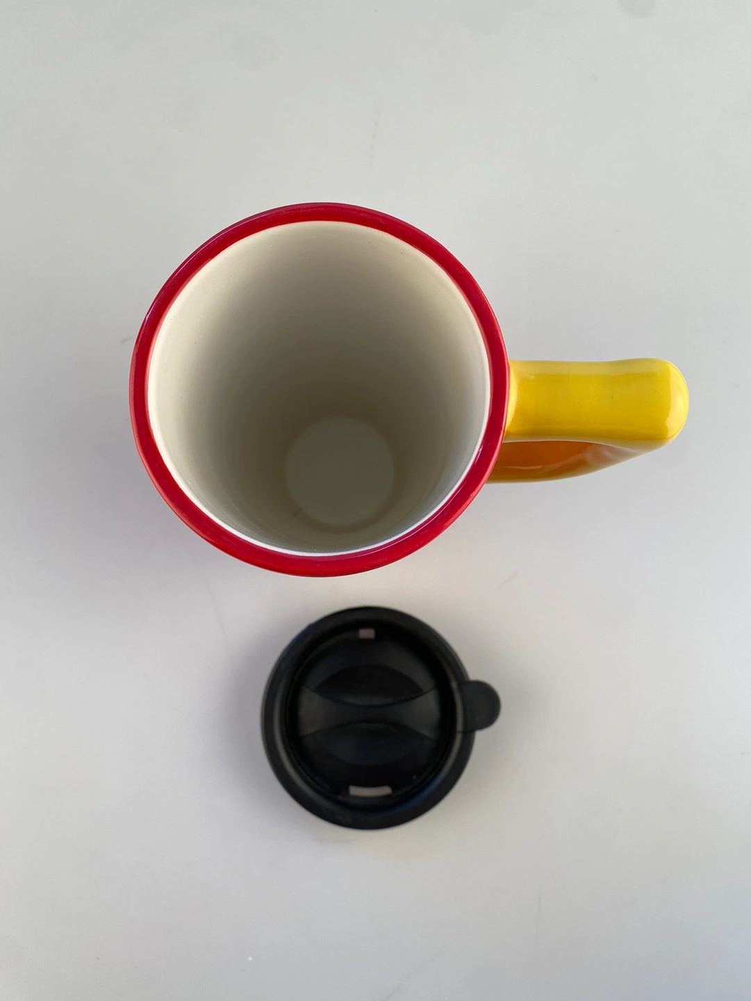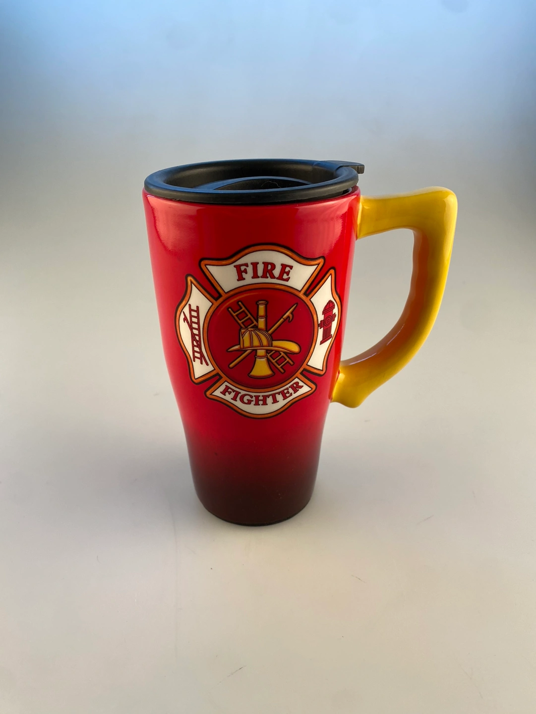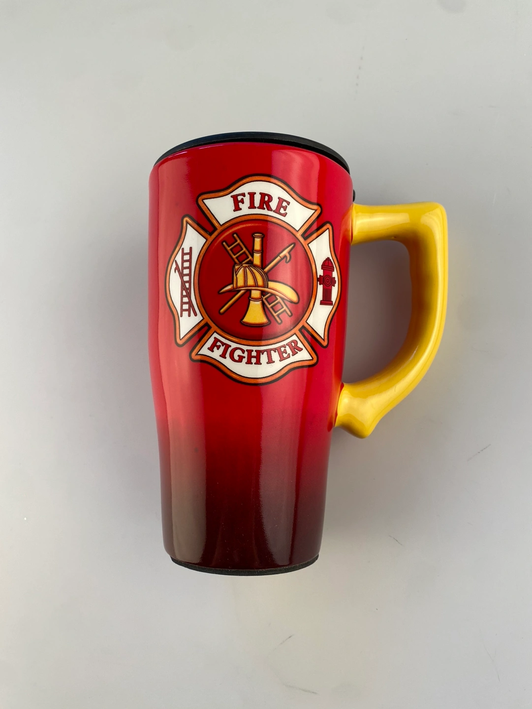 This new tall red & black Firefighter Ceramic Travel Mug has a fire crest design on both sides. Has a large yellow handle and comes with a black plastic lid.