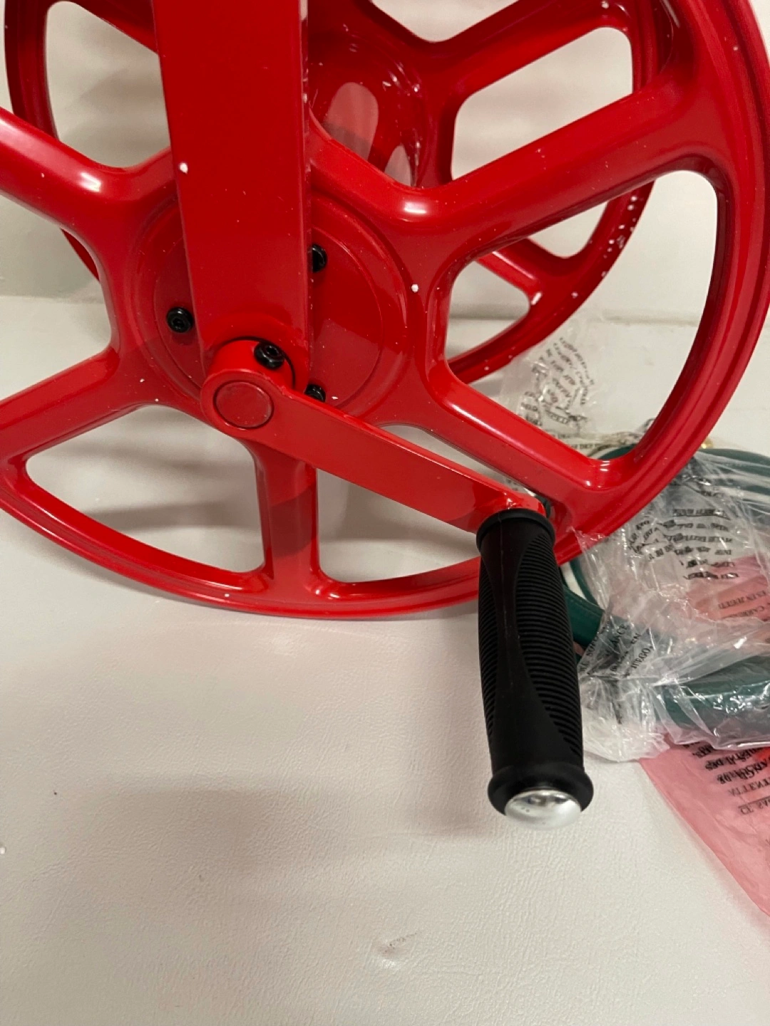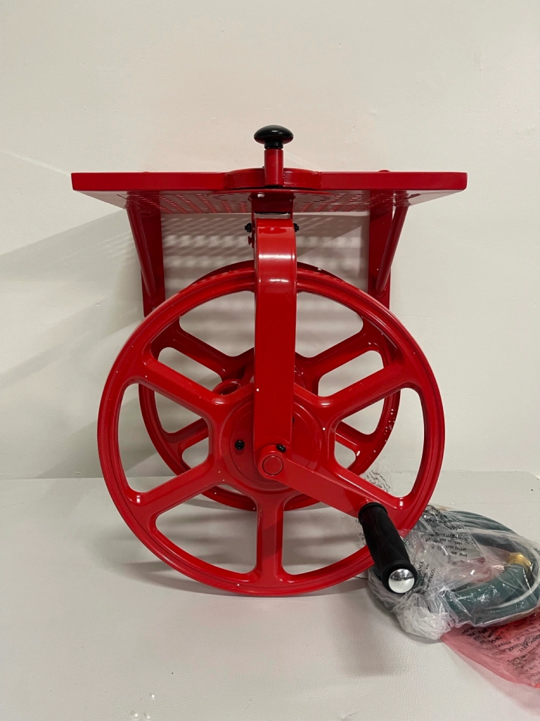 Multi directional hose reel holds 150 feet of 5/8” hose with 5’ of leader hose.